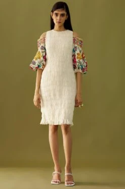 Maximise the life of your wardrobe with this exquisite cold shoulder dress. Cut in cotton, this ruched dress features a floral detail on the sleeves. Style this chic dress with a stack of bracelets to complete the look.