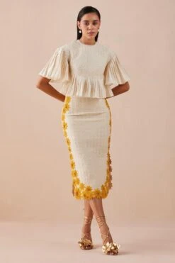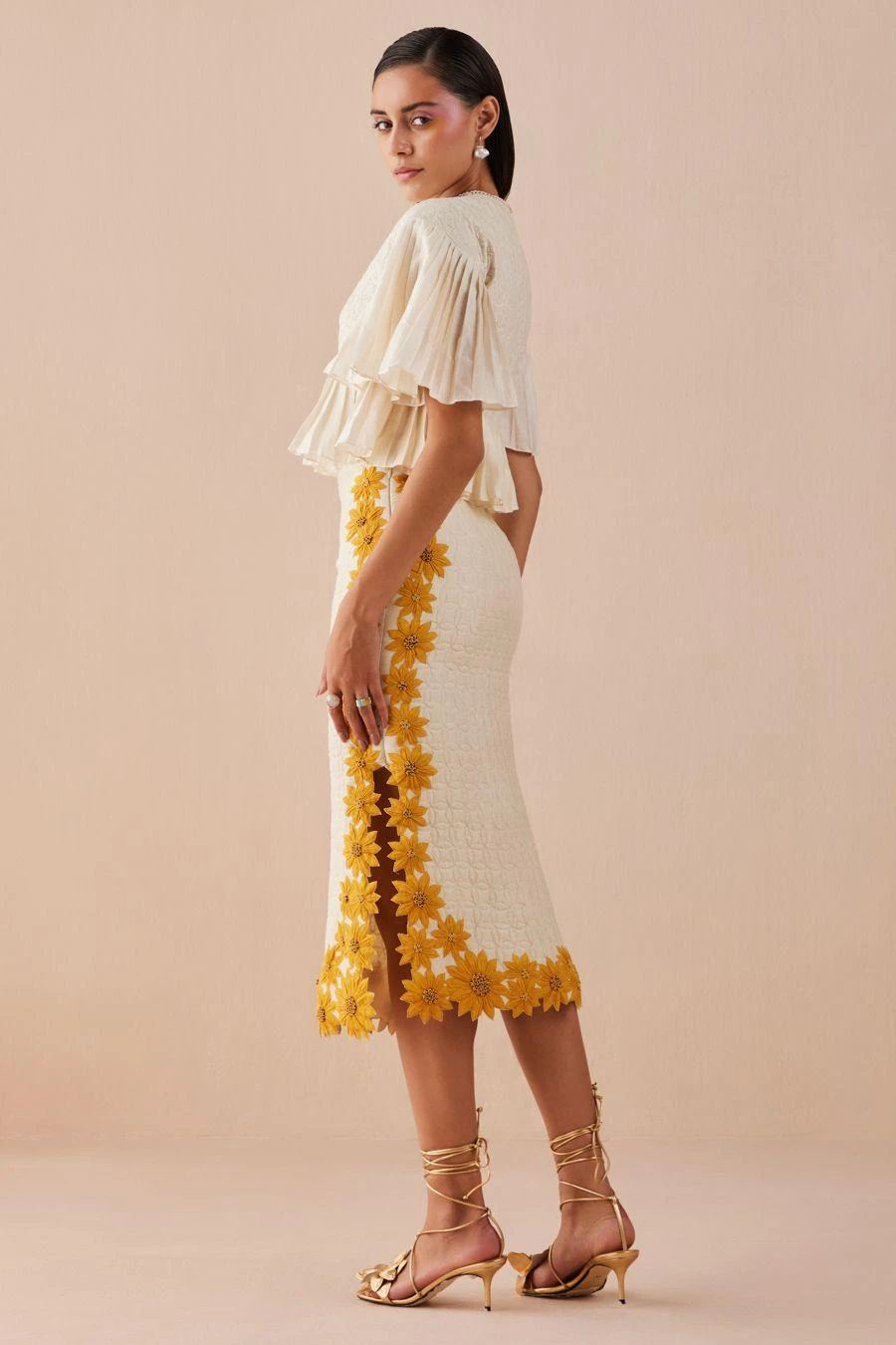 Add a layer of statement and glamour to your resort getaways with this skirt. Crafted in chanderi, this quilted midi skirt comes with sunflower embroidered details. Pair it with the Ivory quilted & pleated top from the collection to complete the set.