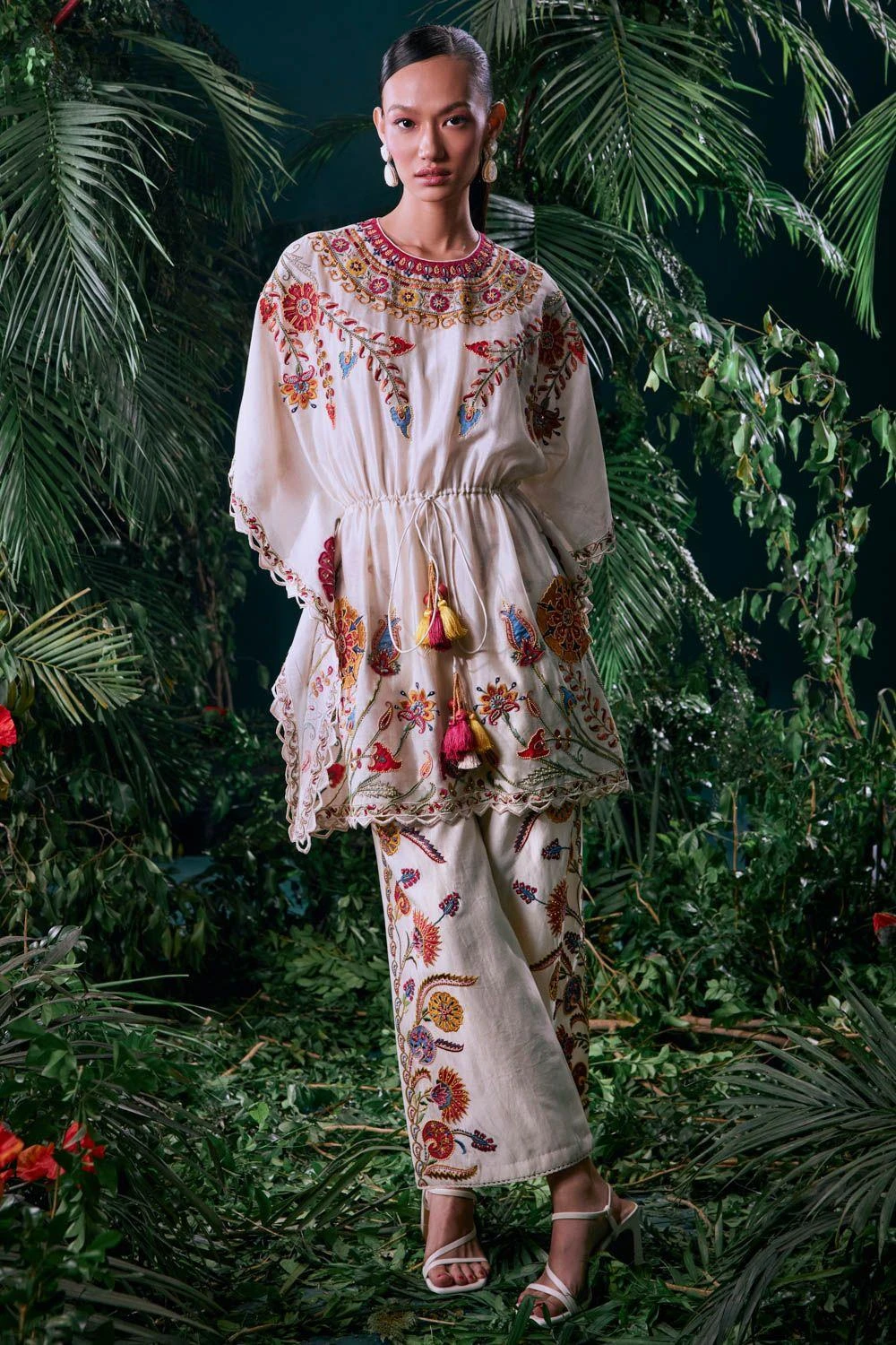 Radiate sophistication in this Ivory kaftan, intricately adorned with exquisite applique, threadwork & intricate beadwork. This ensemble epitomizes the perfect fusion of modern craftsmanship and timeless elegance, making a bold and unique statement.