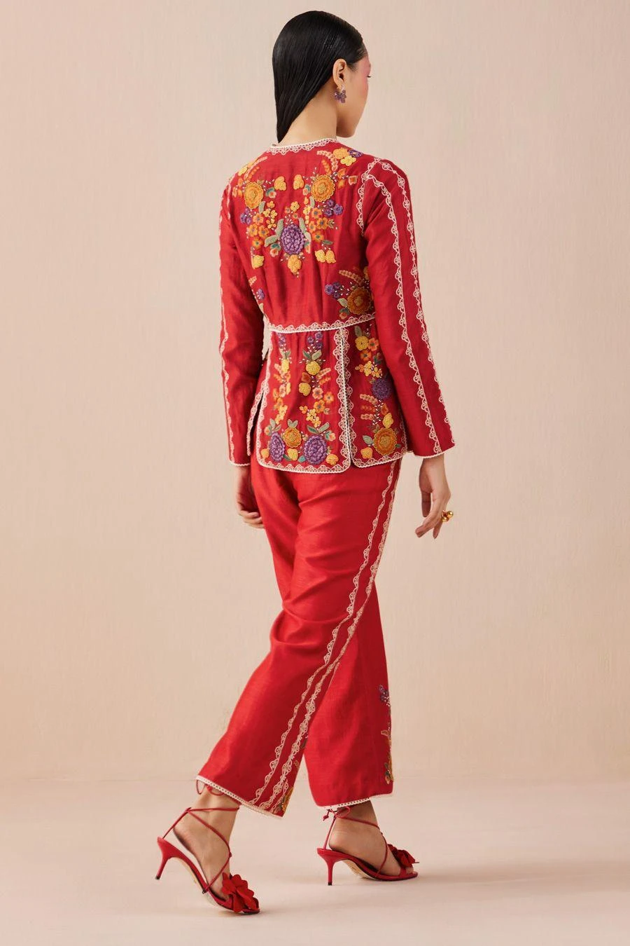 Maximise the life of your wardrobe with this ivory pants. Crafted in chanderi, these straight, cropped pants feature floral threadwork and beadwork details. Pair it with the Red panelled jacket from the collection to complete the set.