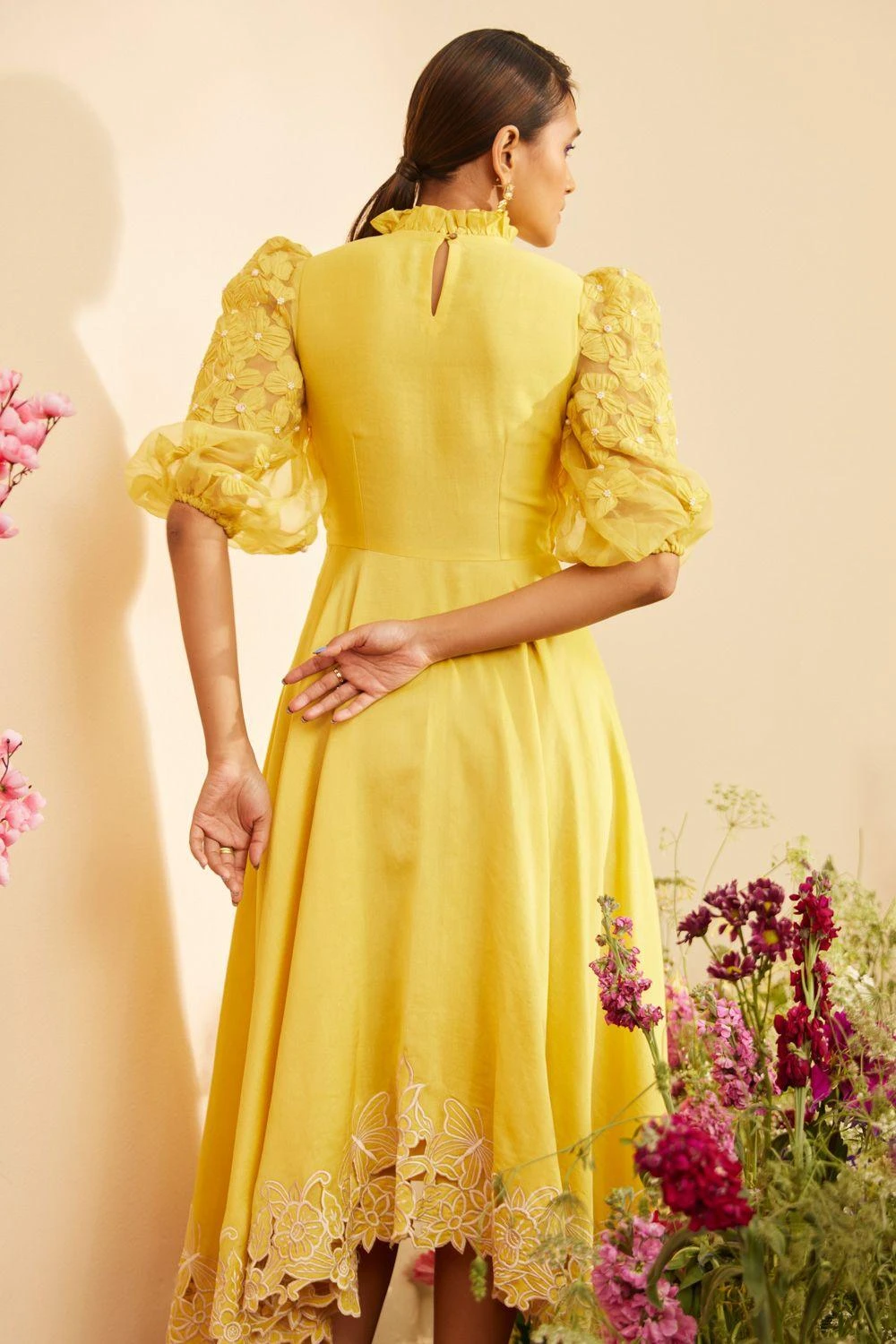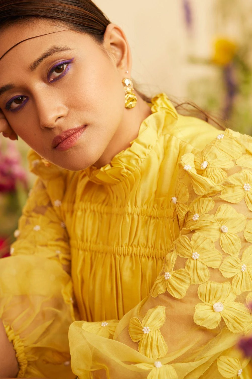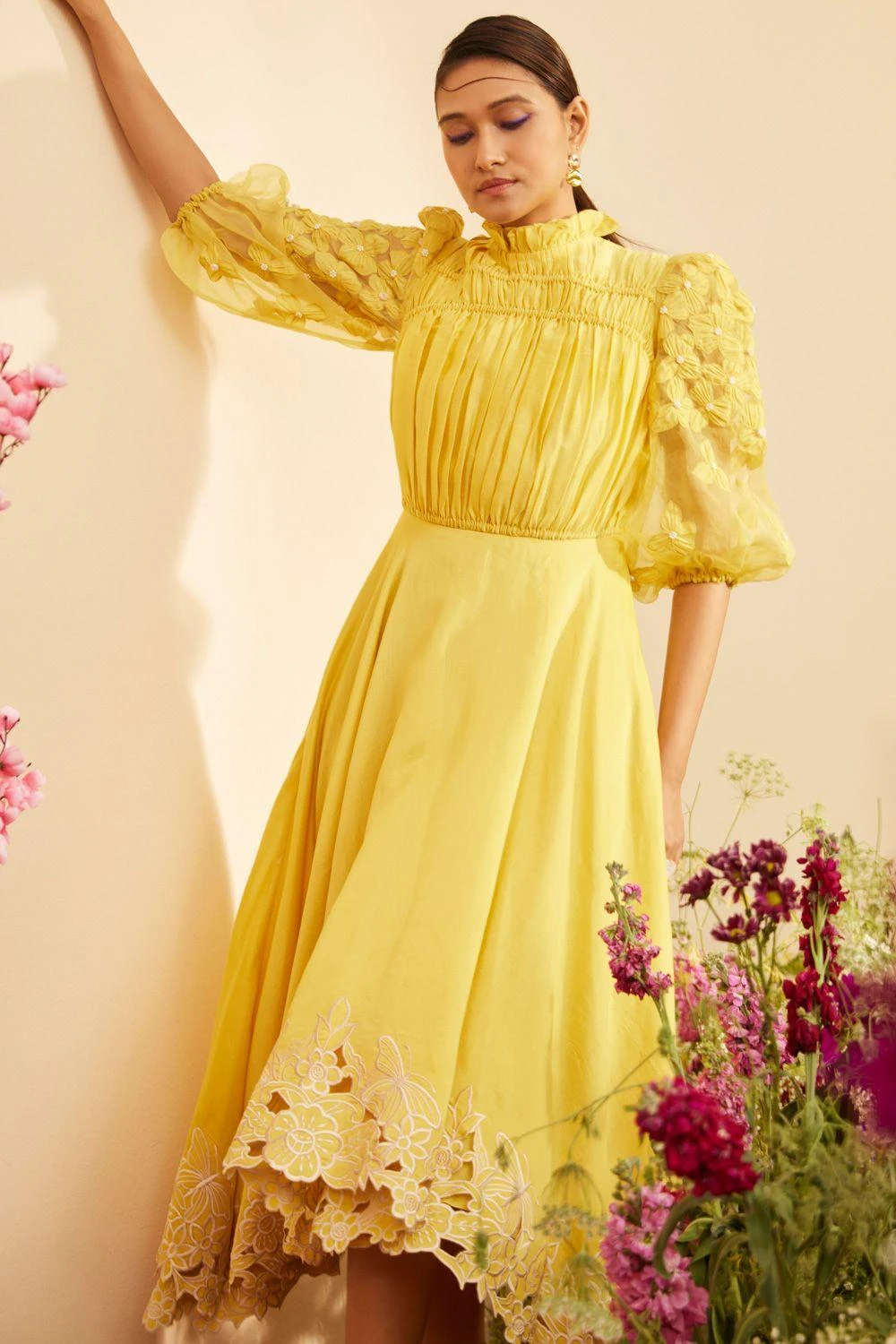Step into elegance with this yellow ruched and cutwork dress, featuring exquisite floral applique organza sleeves. This masterpiece effortlessly blends craftsmanship and style, making it a must-have for the modern connoisseur of fashion.