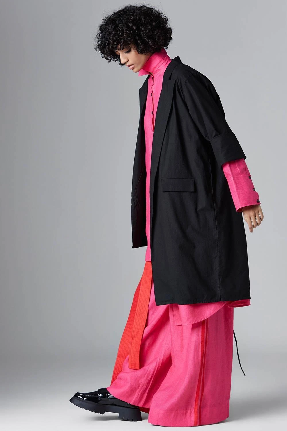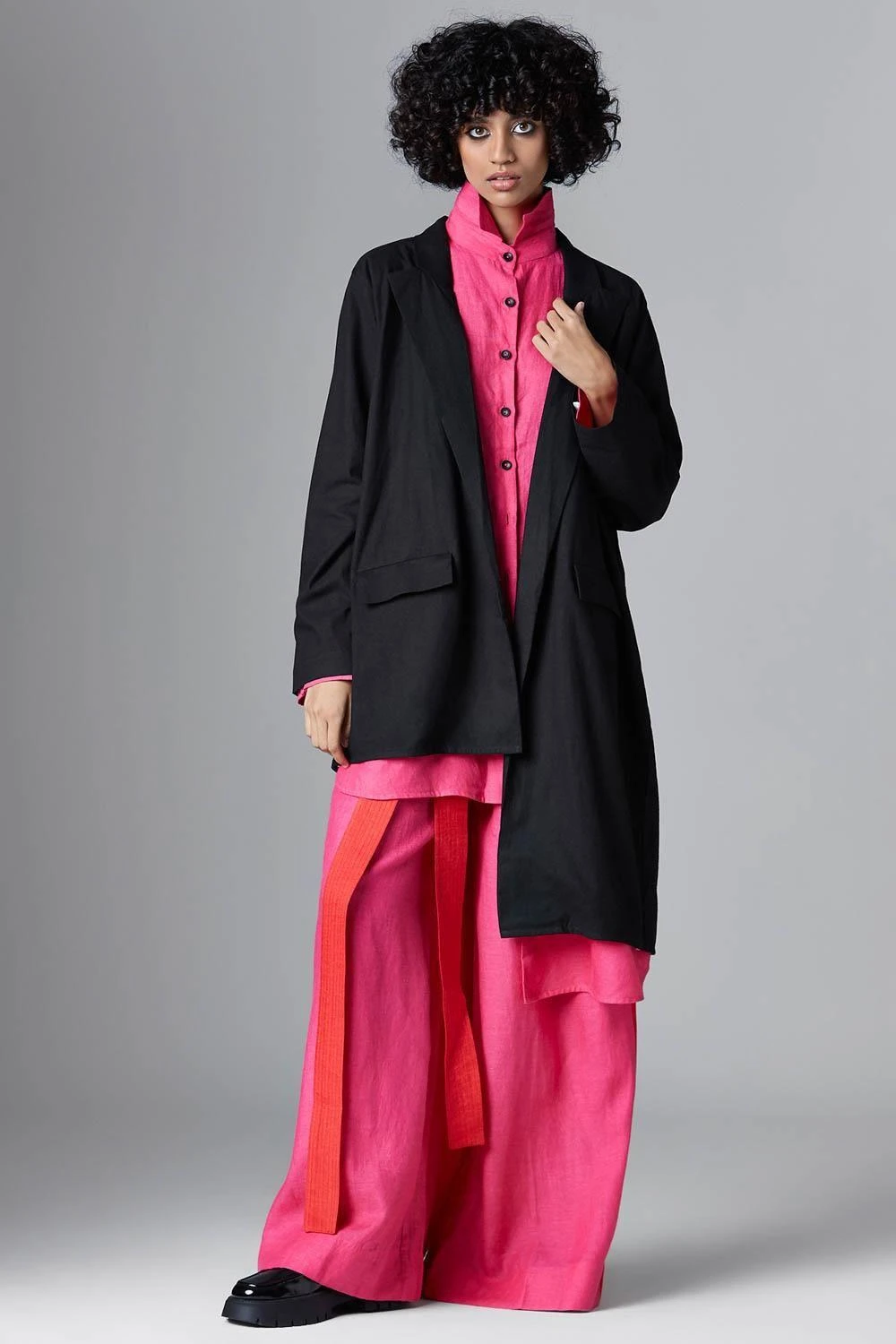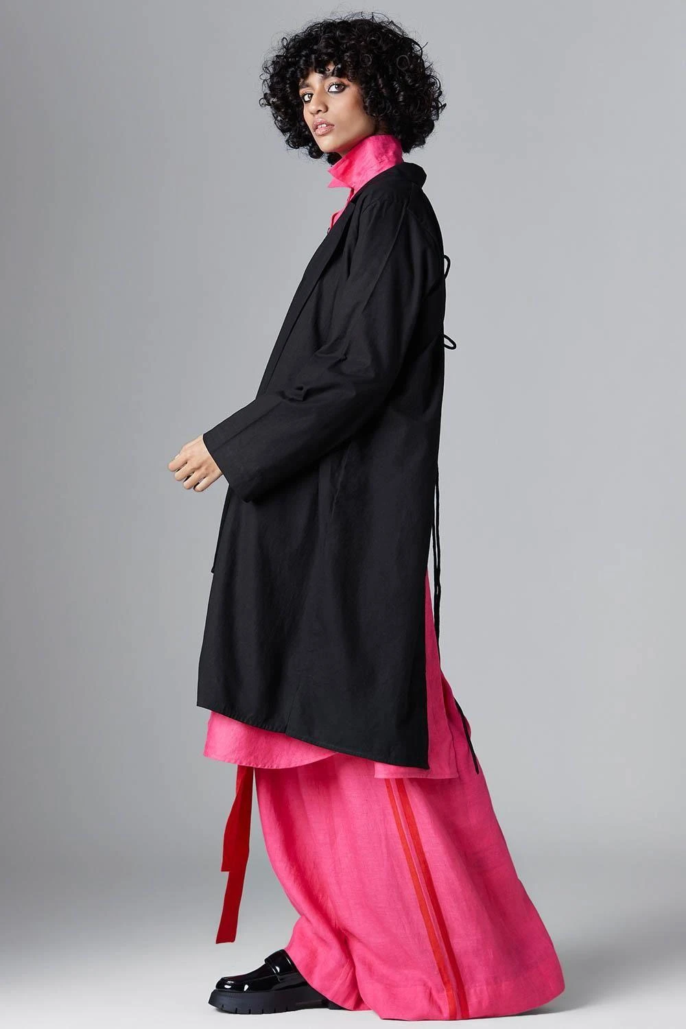 Take your layering game a notch higher with this black jacket. Crafted in organic cotton, this jacket features an uneven style & features a notch collar, straight sleeves and flap pockets on the front with tie-up details at the back.