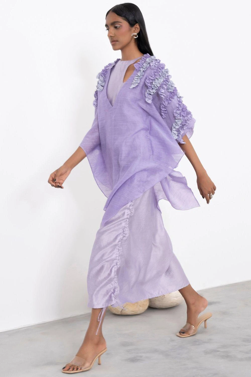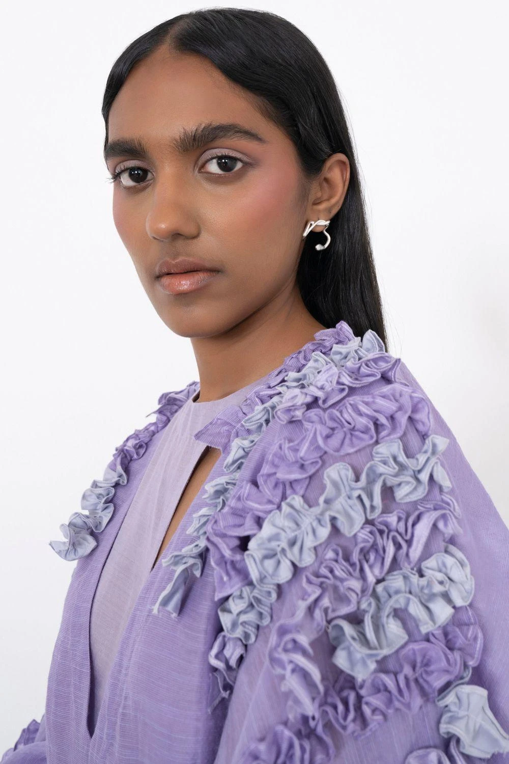 This purple kaftan style cape is a perfect piece for an elevated look. It is cut in self striped organza cotton fabric and highlighted with monotone frills on the shoulder. You can style it with a matching lavender dress from the collection.