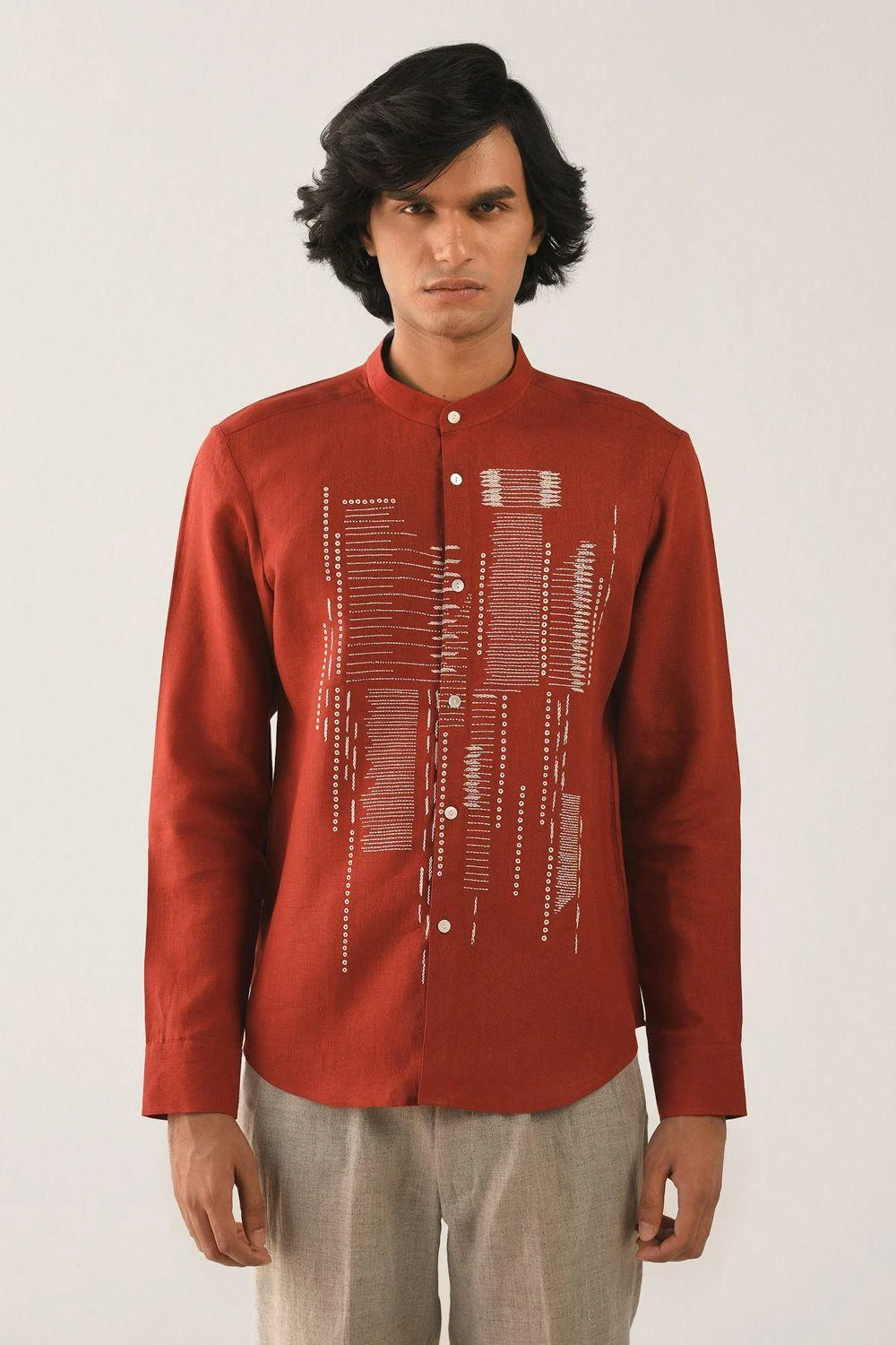 Make your everyday wear stylish with this earth red abstract shirt. It is woven in linen and lifted with intricate hand embroidery in dots & dash arrangement. Style it with a pair of denims or beige pants.