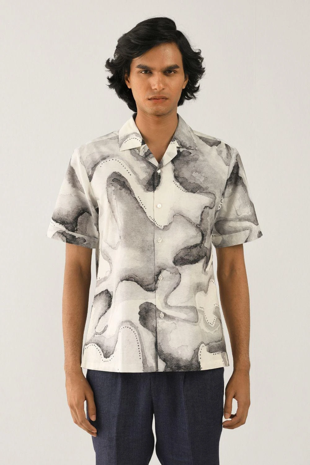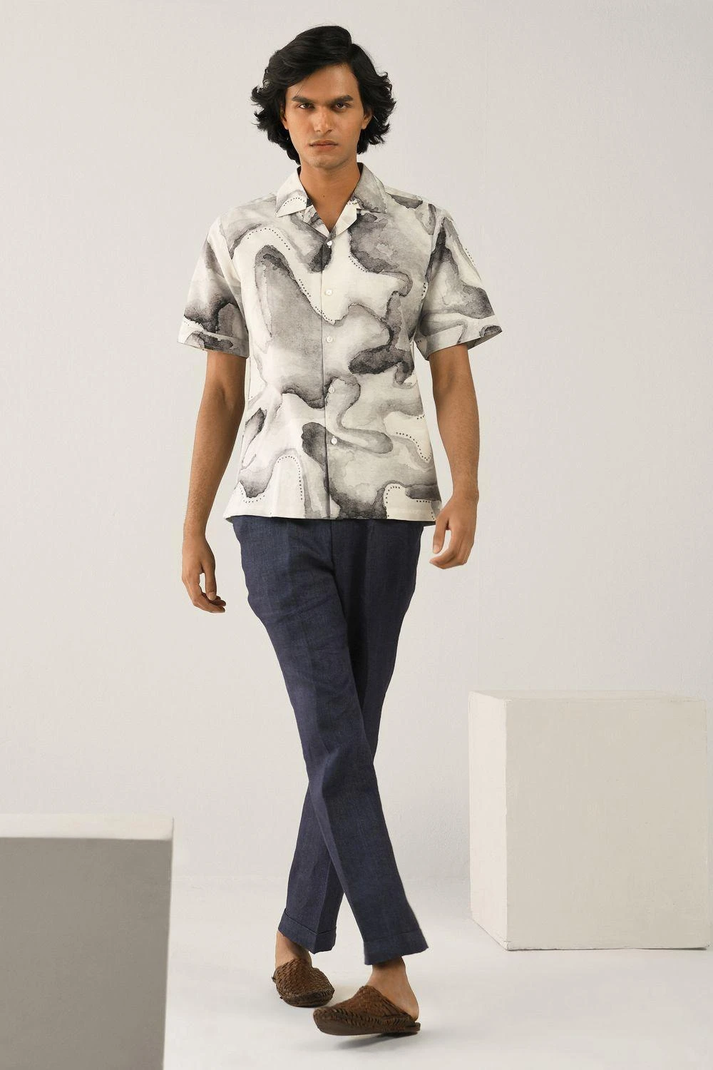 This ivory printed linen shirt will definitely break the monotony of your everyday closet. It is woven in breathable linen fabric with smoke screen print. Style it with a pair of black linen shorts for a weekend getaway.