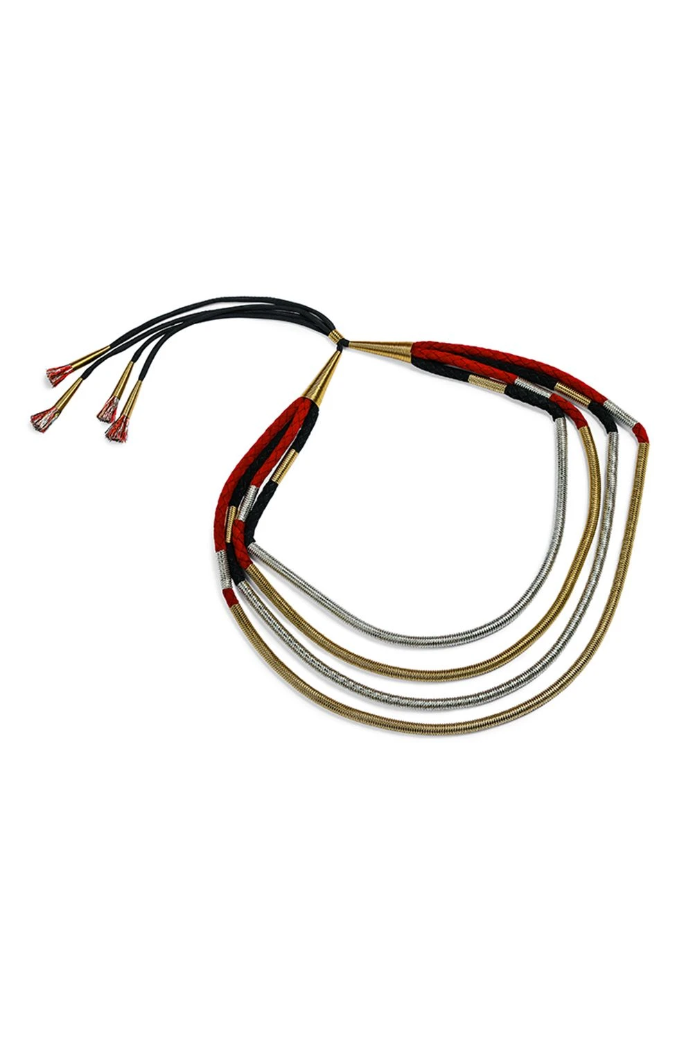 We love the craftsmanship in this plated spring steel and hand braided leather neck piece. Dress up any outfit with this chic neck piece.