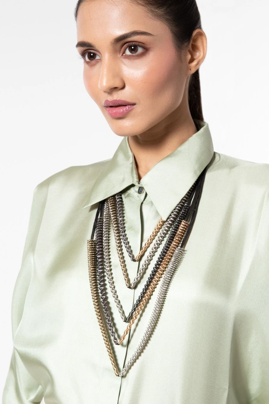 This copper & silver multi-layered necklace is strung in silk dori. It is engineered in plated spring steel in a zigzag pattern. This accessory will definitely add an eclectic touch to your looks.