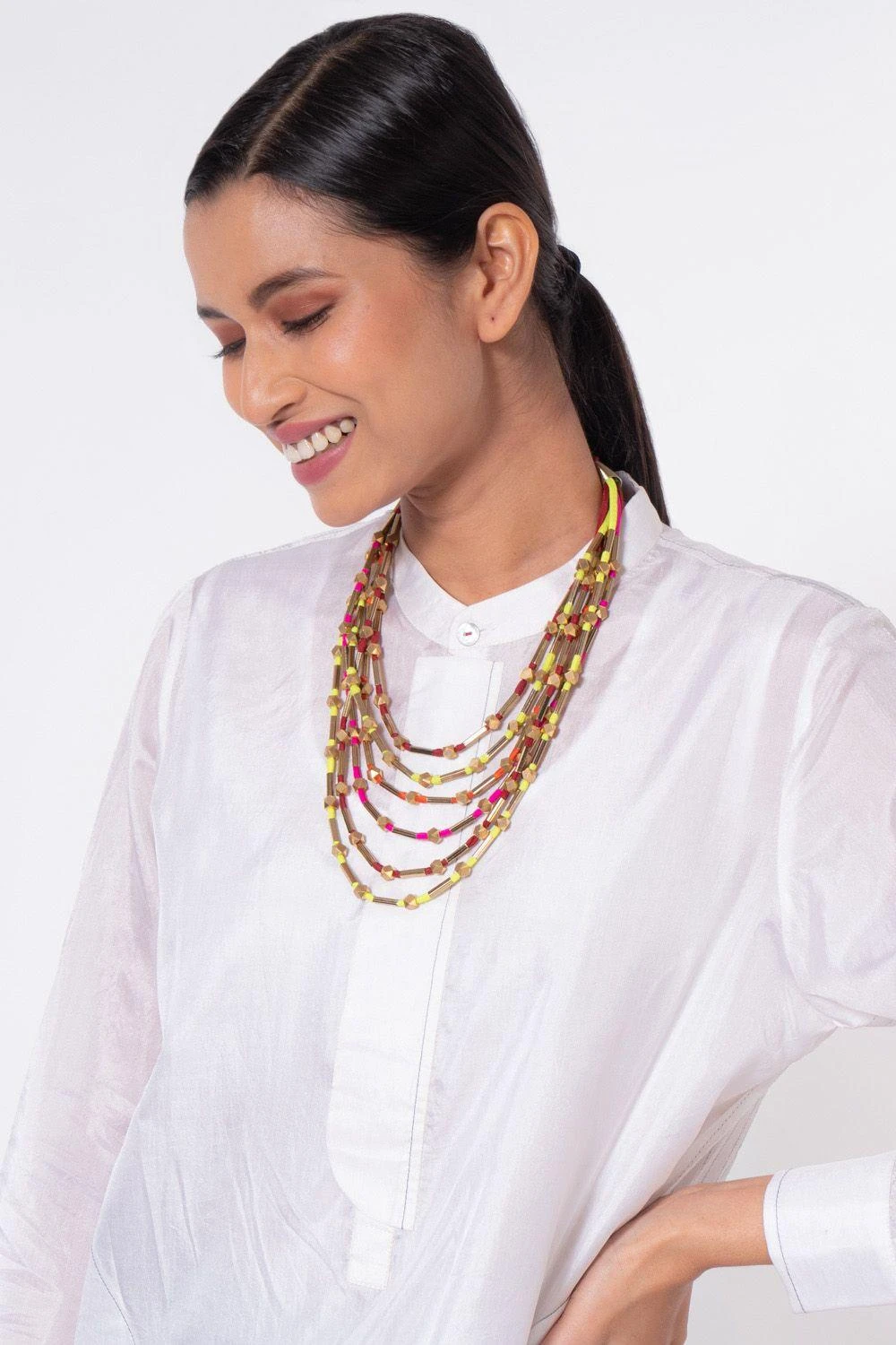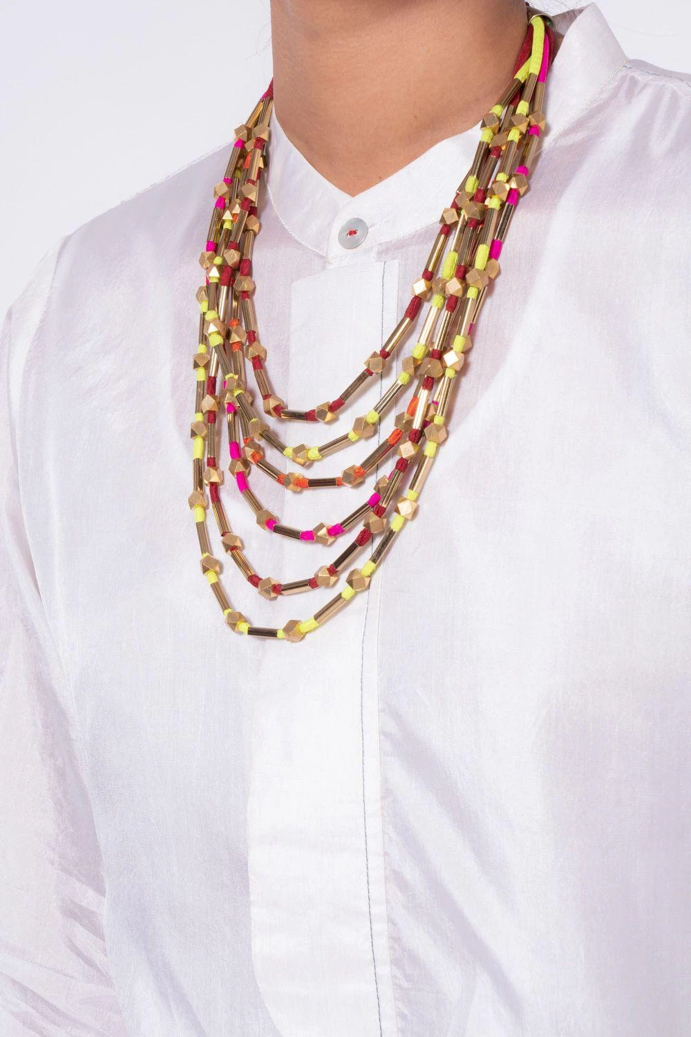 This multi-line stick necklace has a captivating structure and colour play that you’ll enjoy adding to your collection. It is made of silk dori and features plated steel spring sticks. You can wear it with a simple kurta or kaftan.