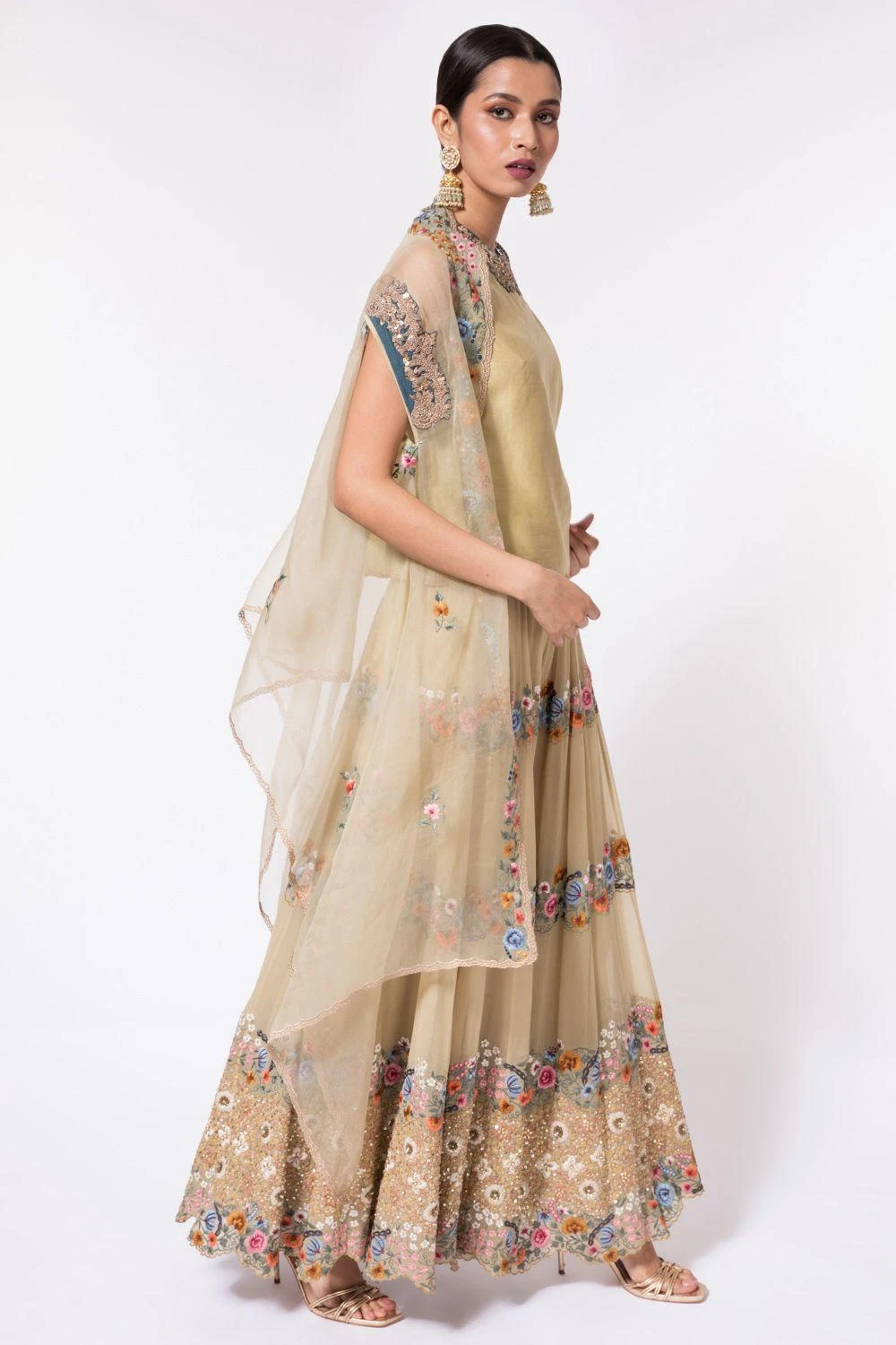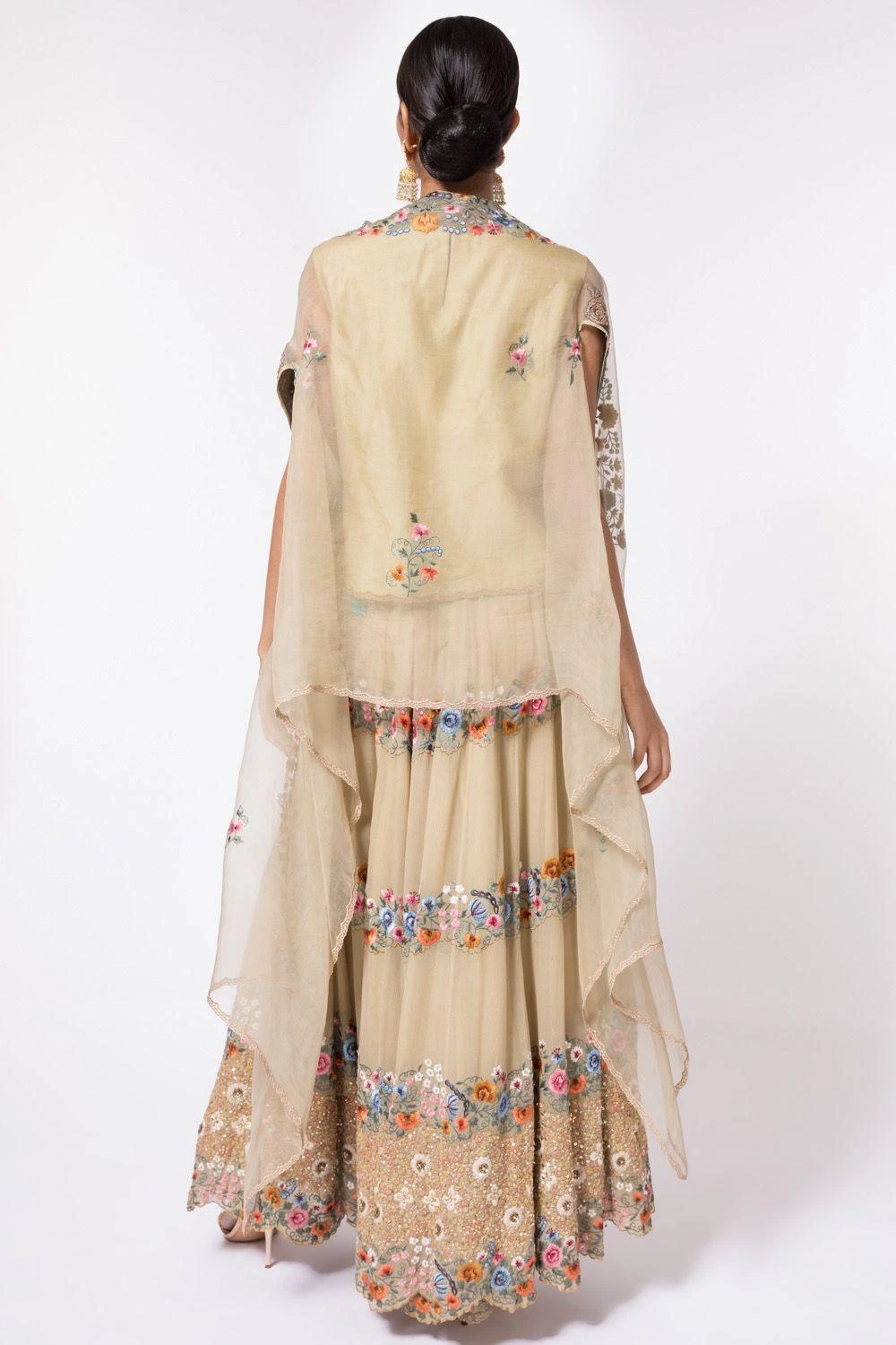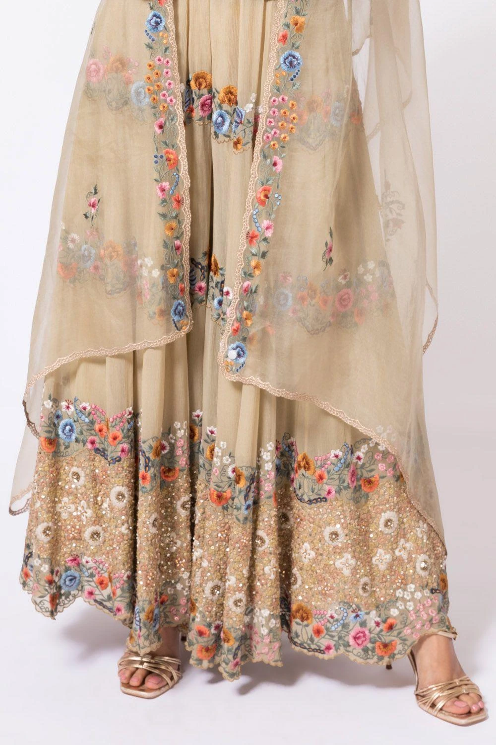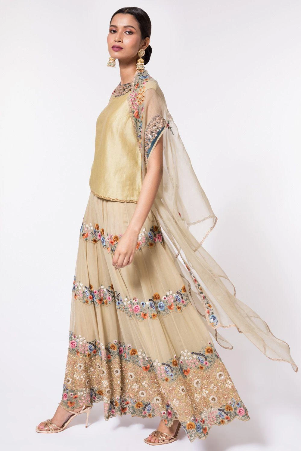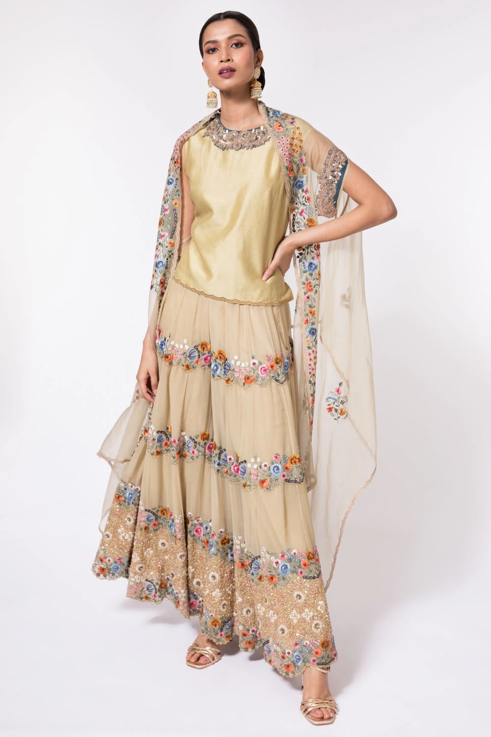 Summer celebrations call for light palettes & silhouettes that will carry you from day to night in ease. This ensemble will serve your needs perfectly. It features an embroidered chanderi top, paired with matching chiffon sharara and an organza cape.