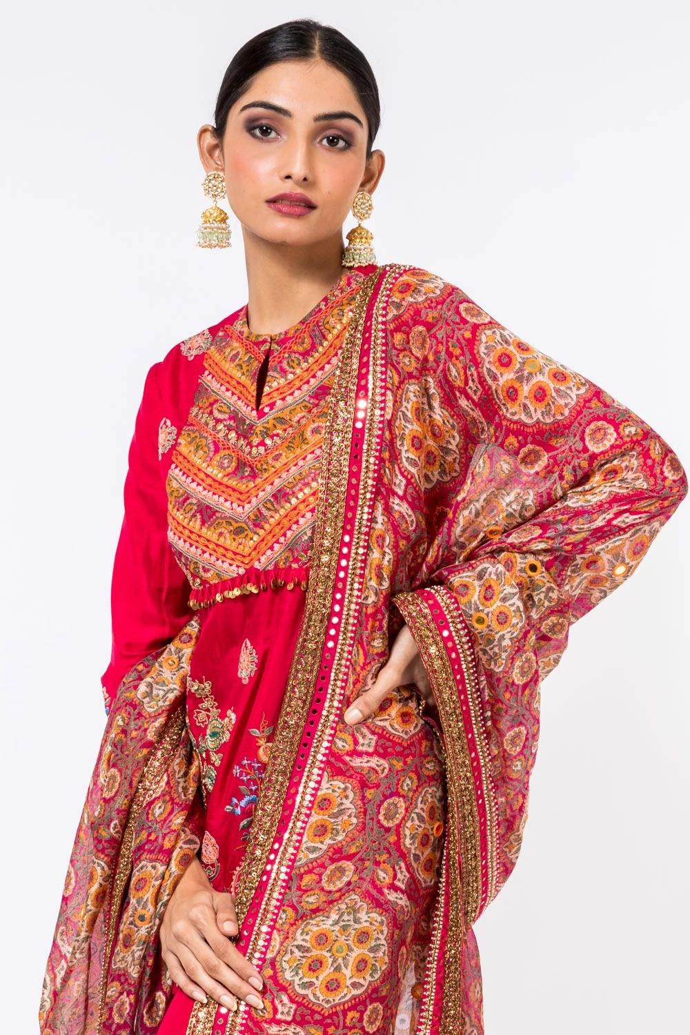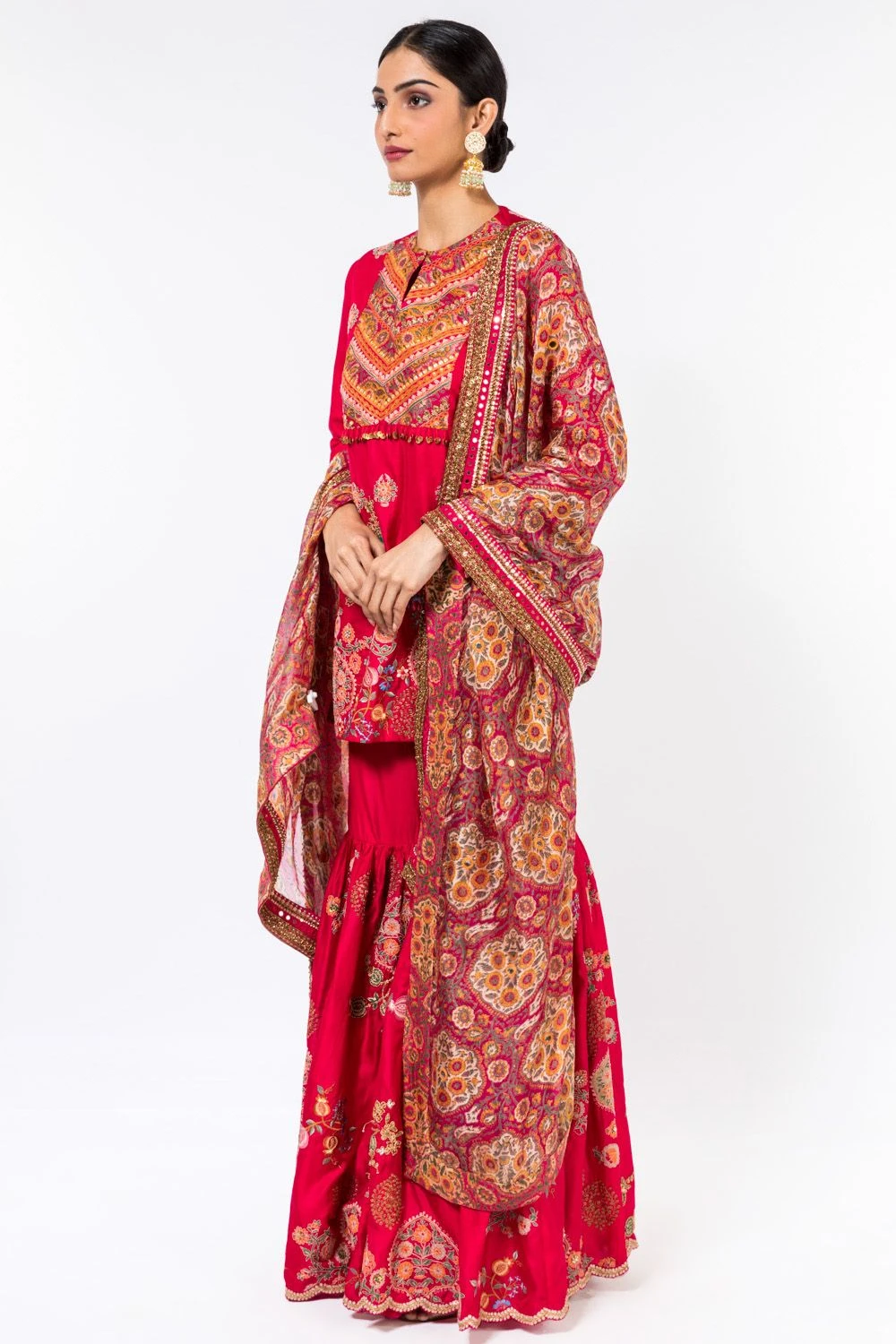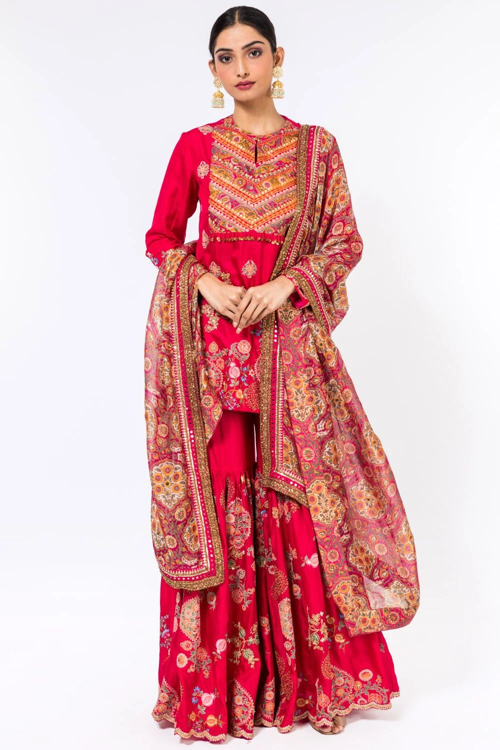 Classic tones & timeless silhouette is just what you need for your festivities. This magenta pink sharara set is made in chanderi silk and adorned with fine embroidery details. The set is complemented with a printed organza dupatta.