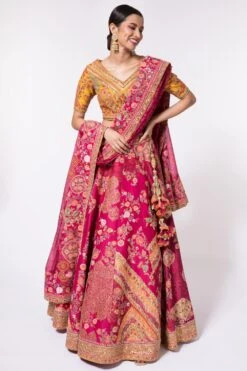 This magenta pink lehenga set exudes royalty & grandeur with its every bit. It features a voluminous lehenga adorned with embroidery details. It is paired with a V-neck matching blouse and a dupatta. Adorn a polki necklace with this look