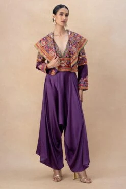 This stunning purple lapel jacket is embellished with delicate thread & sequin embroidery. The kurta comes with coordinating pants. This piece is perfect for engagement & mehendi functions.
