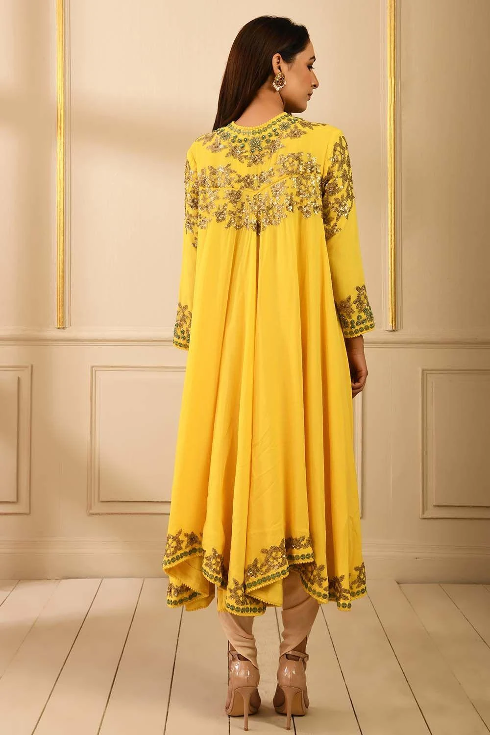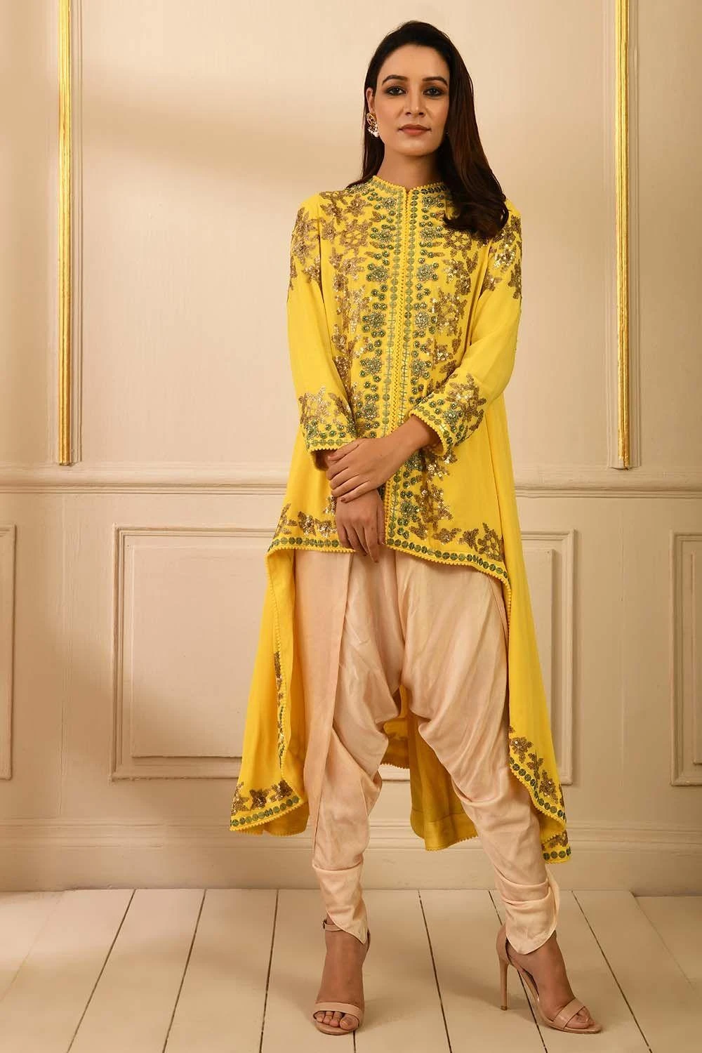This yellow jacket is adorned with delicate green threadwork & sequin embroidery. The set comes with beige dhoti pants to complete the look. Style this piece for an effortless mehendi look, this outfit is perfect for destination weddings.