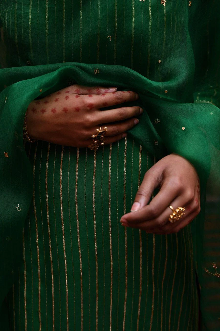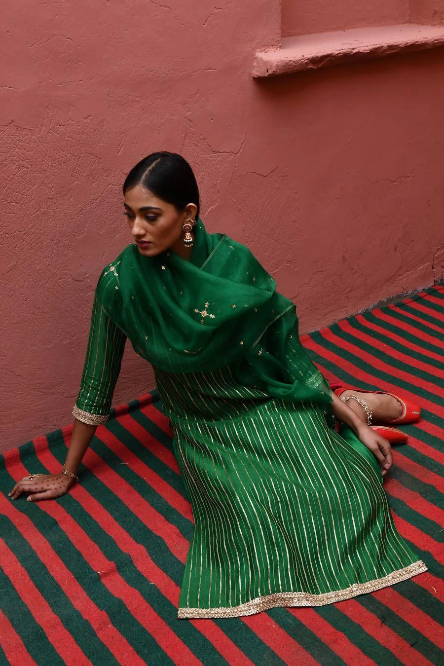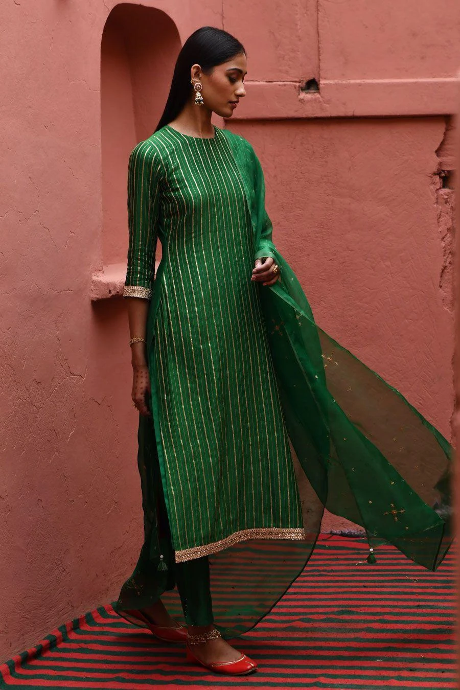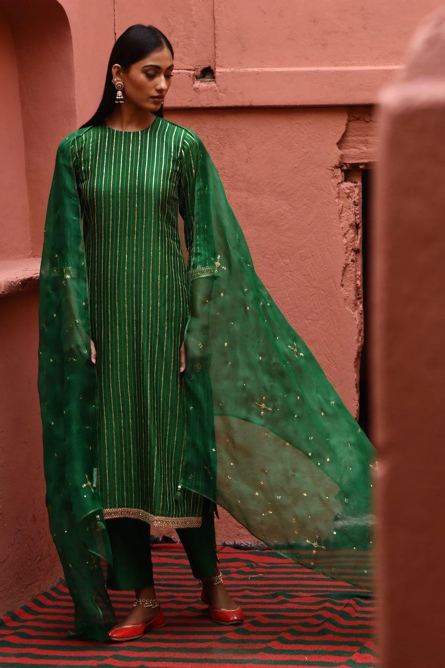 The perfect amalgamation of style & comfort, this set is perfect for a day out. Crafted in chanderi, this set features a zardosi embroidered kurta paired with straight pants & an embellished dupatta.