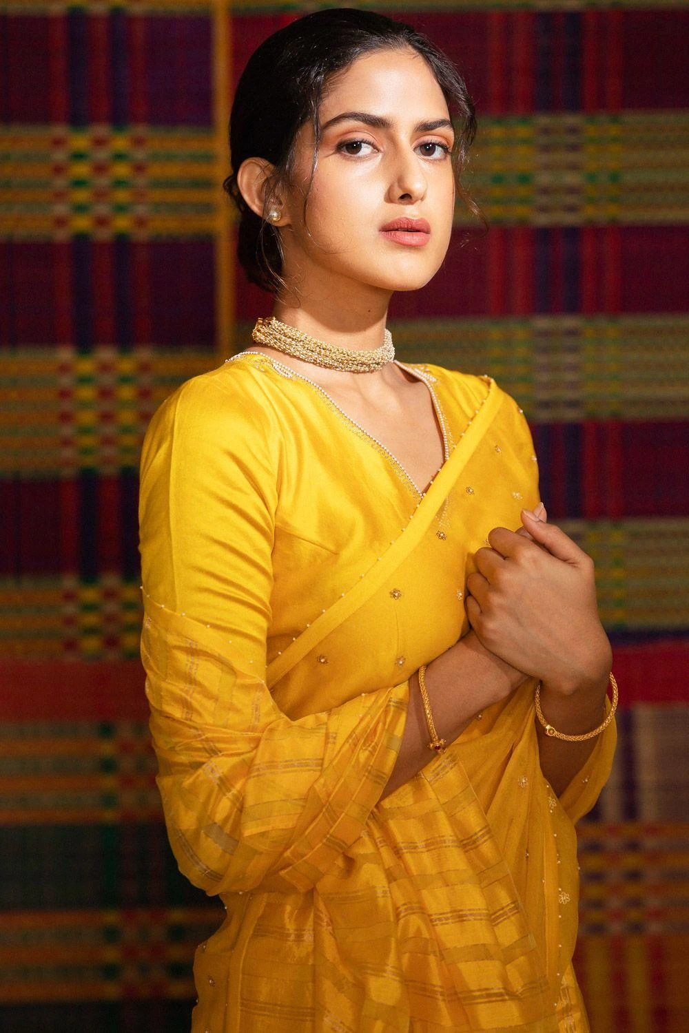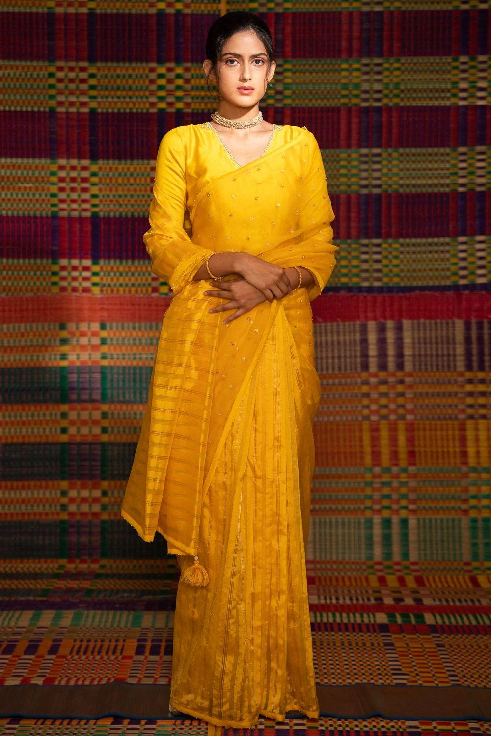 Timeless & elegant, this bright yellow sari is a festive staple piece. It is woven in half chanderi & half organza and adorned with intricate hand embroidery. It comes with a hand embroidered V neck blouse that perfectly complements the sari.