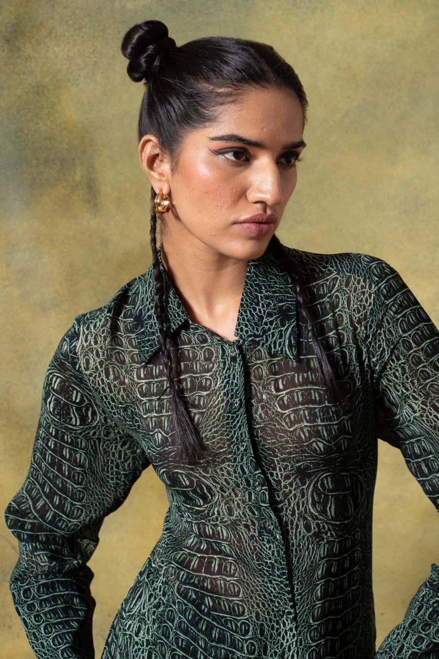 Look effortlessly stylish with this green dress. Crafted in viscose crepe, this buttoned down relaxed fit features reptilian print all over and comes with coordinating pants. Add a pair of dangler earrings to complete the look.