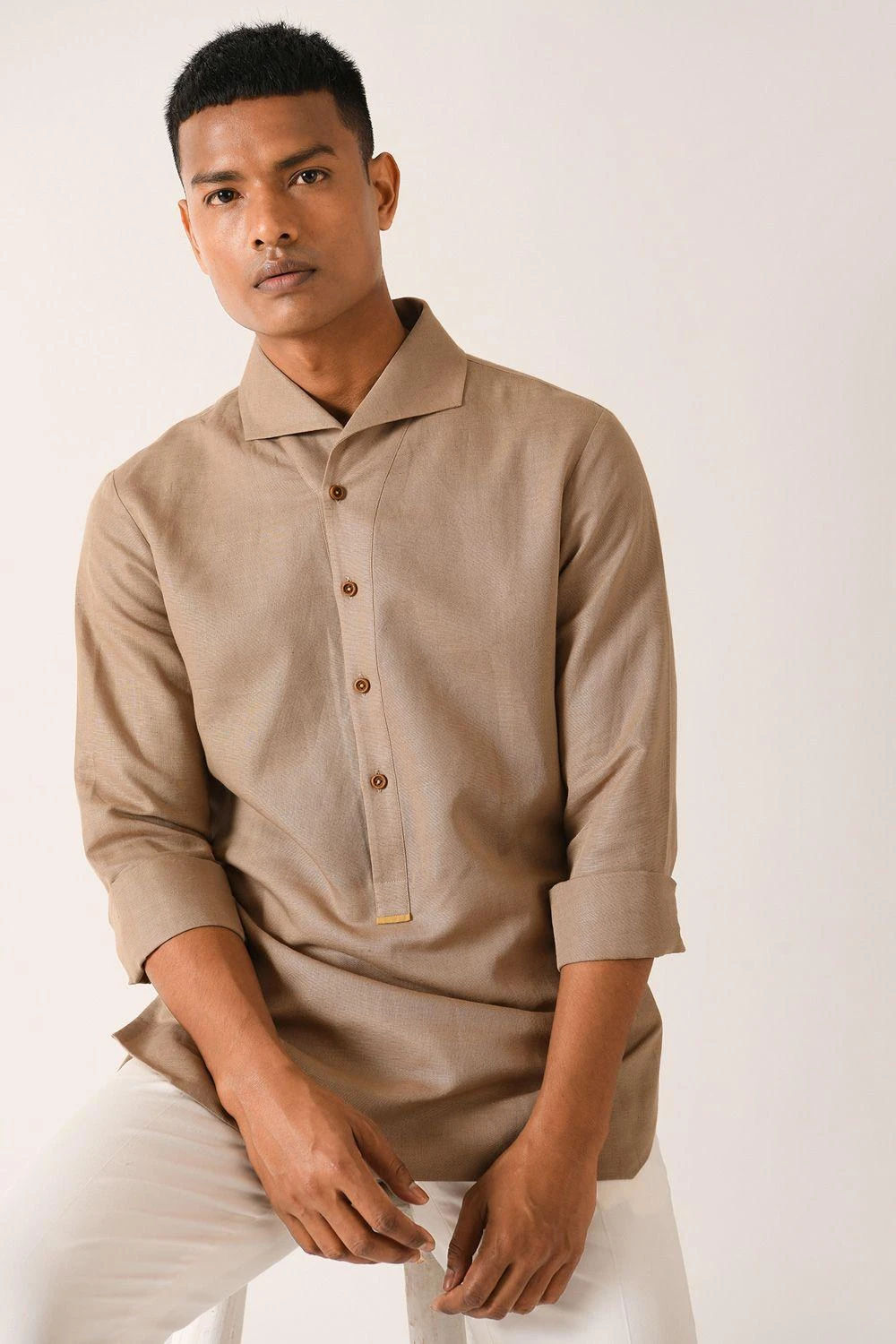 This beige classic shirt is a no-brainer piece to add to your closet. It is cut in fine cotton linen fabric and features a seamless kurta collar. You can team it up with a pair of black trousers.