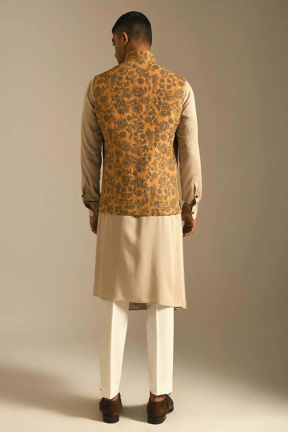 This ochre toned jawahar jacket is crafted in silk with subtle toned embroidery all over. This bandhgala jacket can be styled over a crisp shirt and sharp pants to achieve a dapper look. It will be a stylish choice for your day time weddings.