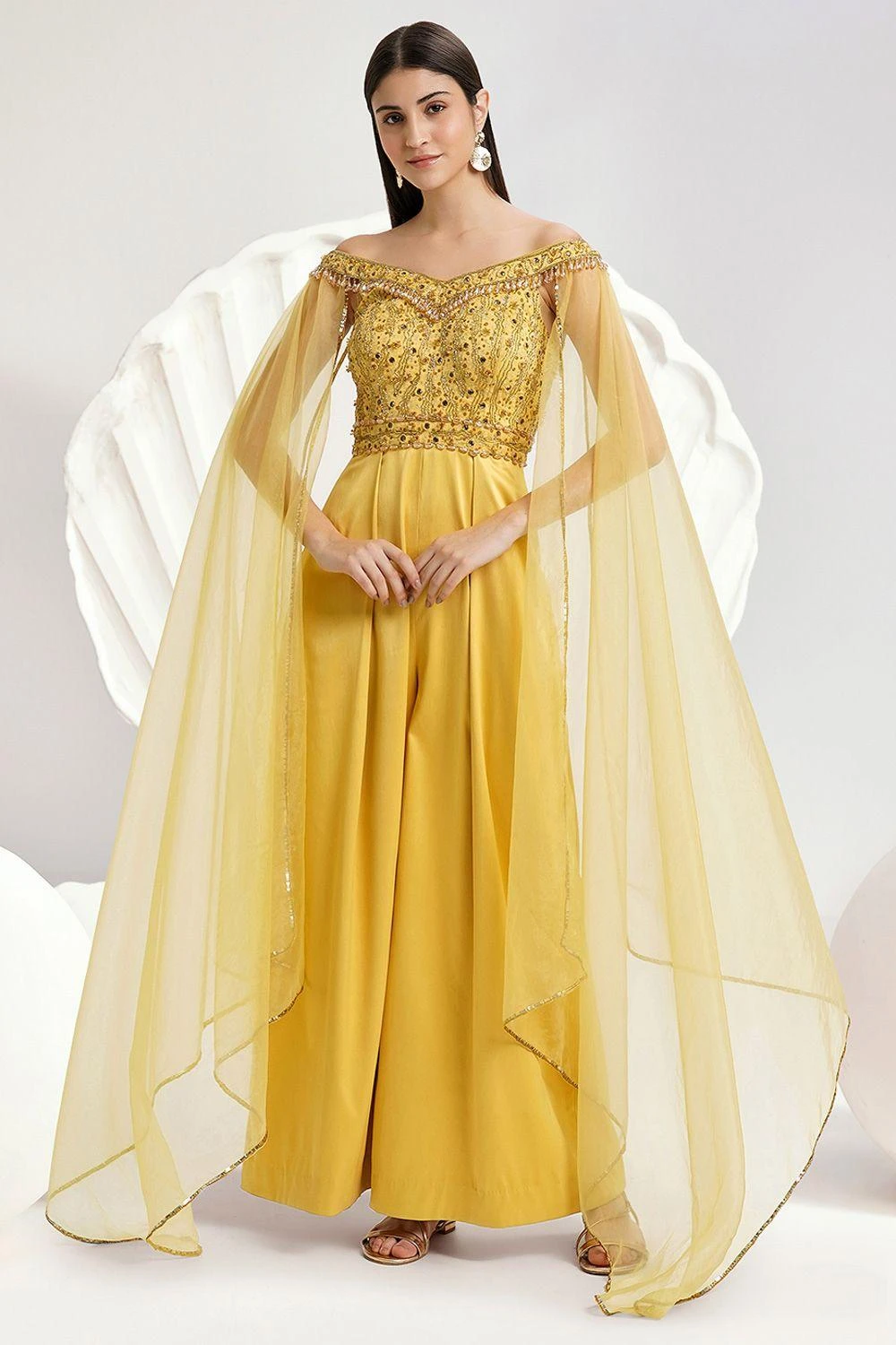 Embrace grace in the embellished Emma Jumpsuitùcrafted for elegant dreams. Featuring grand cape sleeves and wide-leg pleated trousers, it’s a glide towards sophistication and style.