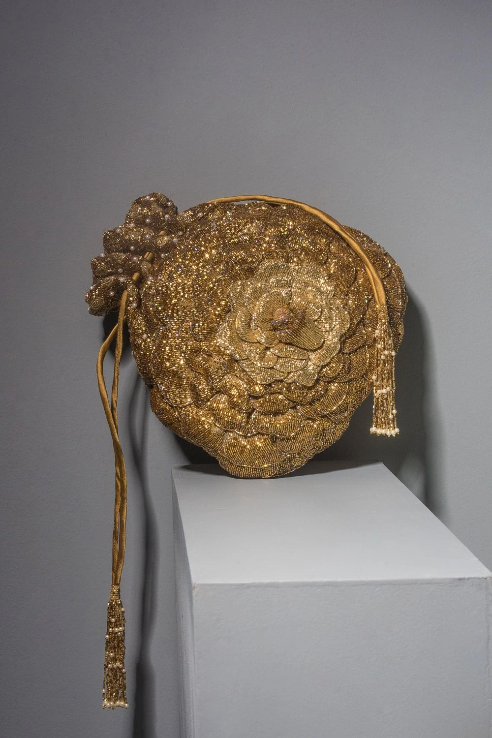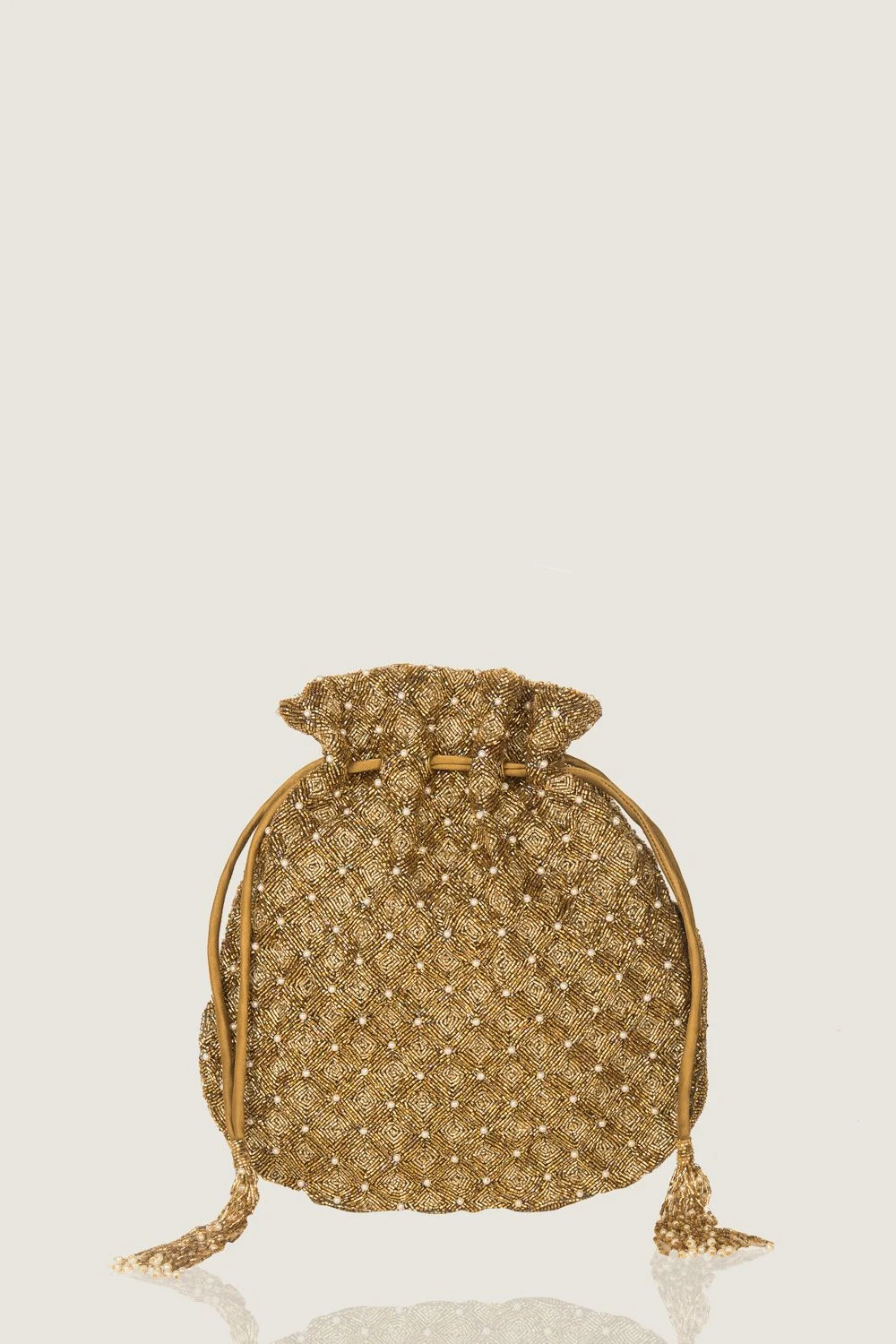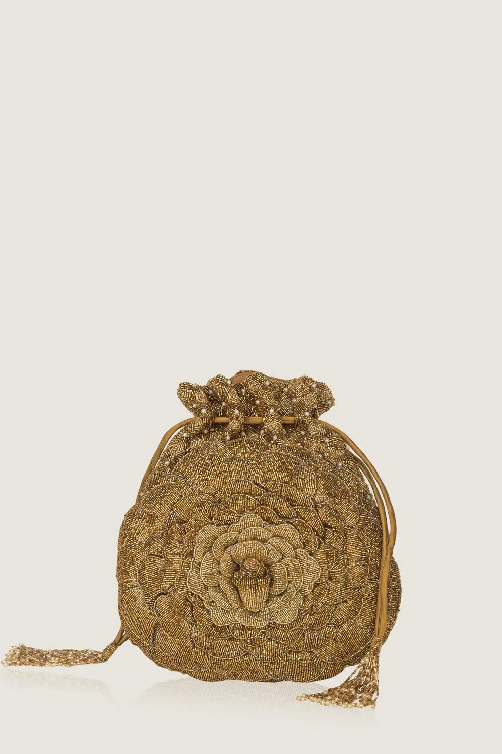 Let glamour take over your evening with this scintillating bella gold potli bag. It is made in recycled poly satin and curated with intricately hand embroidered beaded petals. You can team it up with an evening gown.