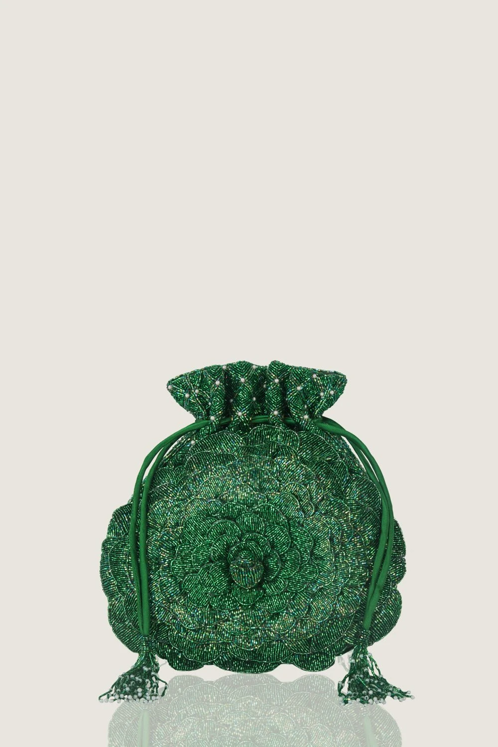 Let glamour take over your evening with this scintillating bella green potli bag. It is made in recycled poly satin and curated with intricately hand embroidered beaded petals. You can team it up with an evening gown.