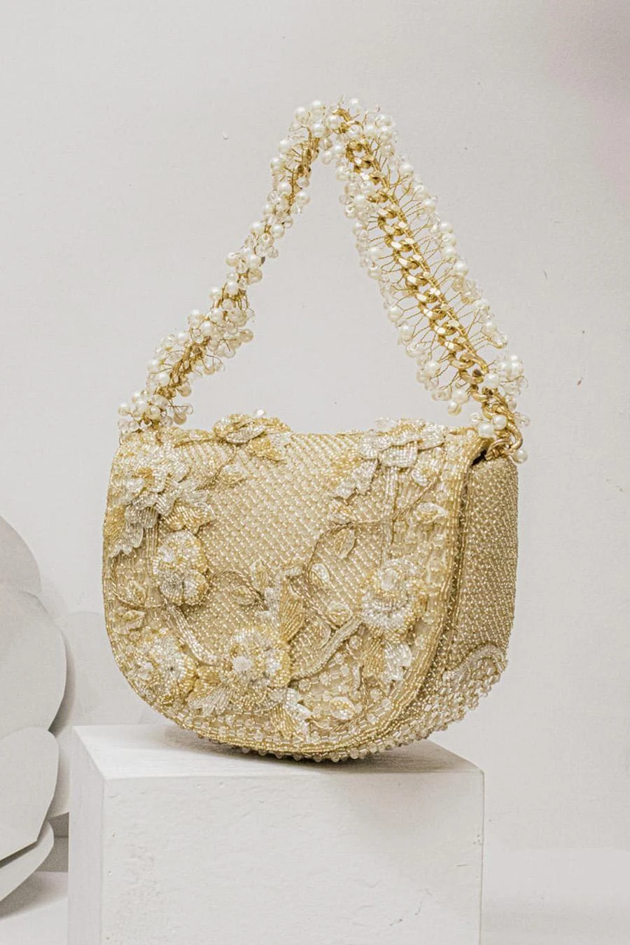 Glam up your evening look with this gold alchymist clutch. Delicate & romantic, this clutch is made with hand-beaded roses, vines, and leaves with the best Japanese beads and glass crystals.