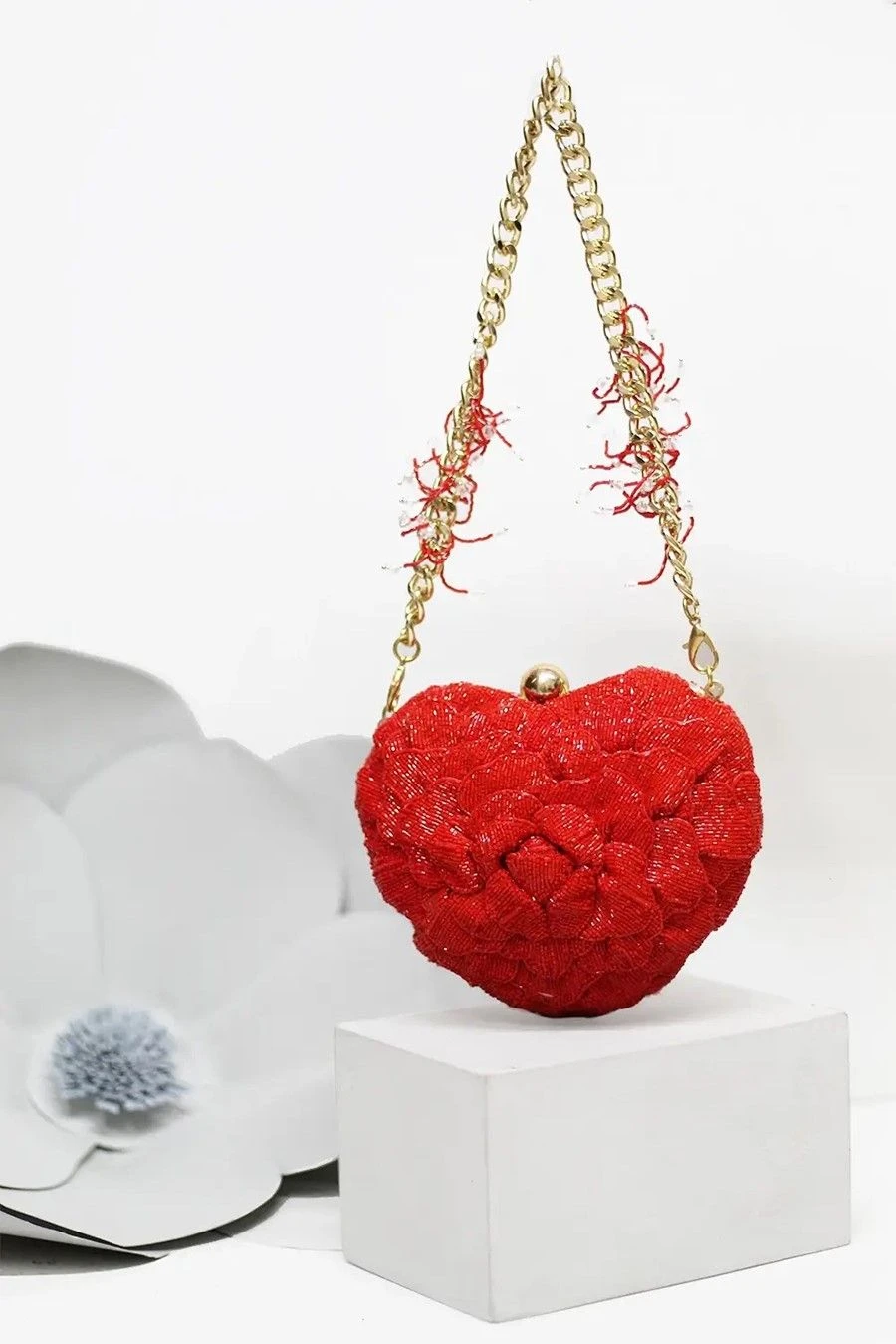 Indulge in the artful elegance of the Isa clutch – a formidable & poised accessory that exudes avant-garde sophistication. Crafted in a heart shape, this piece is adorned with hand-embroidered petals, assembled to create a rose in full bloom.