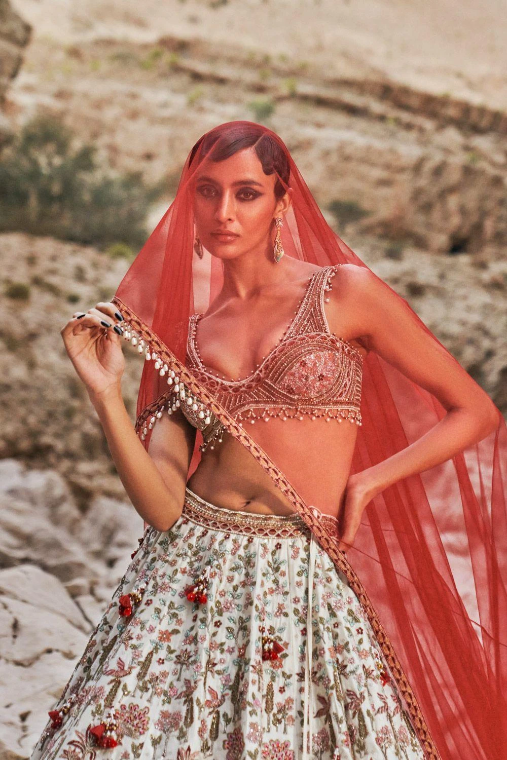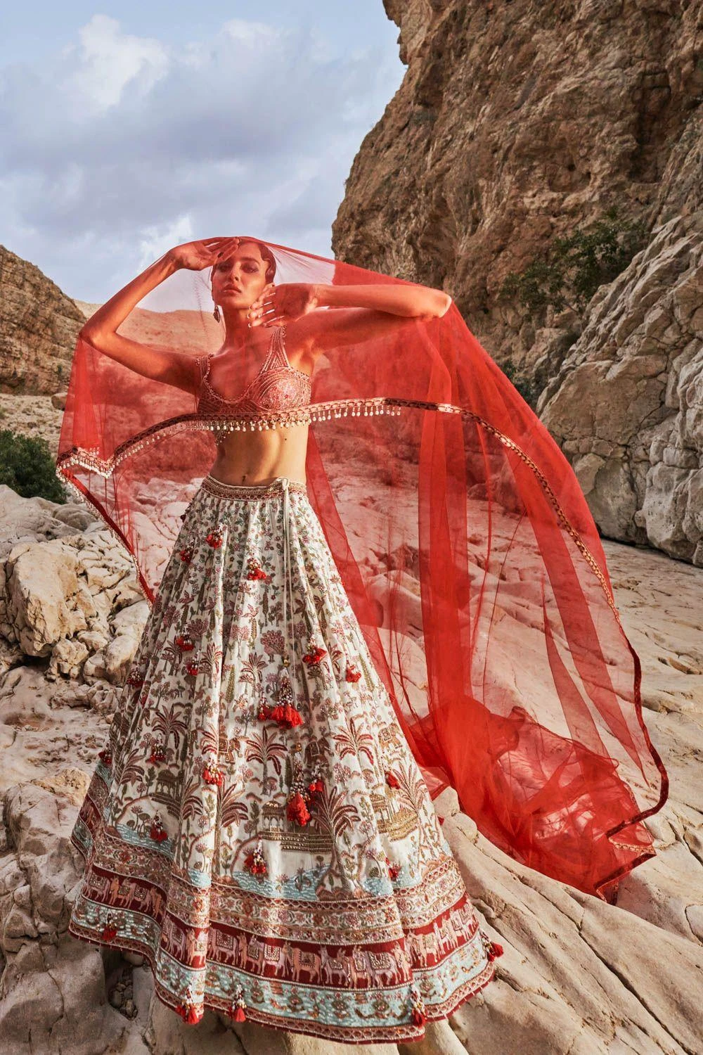 This ivory lehenga speaks of grandiose & royalty. Crafted in chanderi silk, this set features a pichwai artwork inspired lehenga paired with an equally versatile blouse and a dupatta embellished with resham threads, dori, pearls and sequin work.