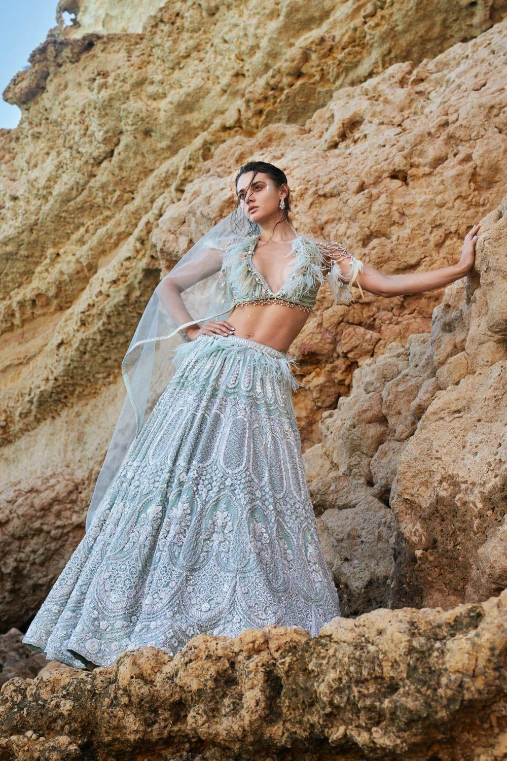 If you’re looking for a head-turning statement-making outfit, this is the lehenga set for you. Crafted in silk organza, this set features a zardosi and crystal embellished lehenga paired with an equally versatile blouse and a dupatta.