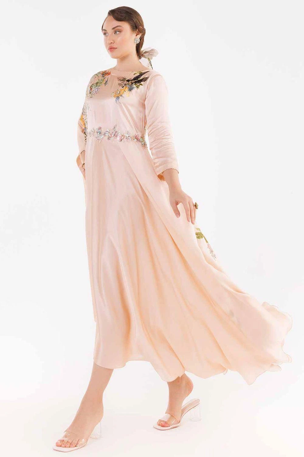 Embrace elegance with this asymmetric silk kaftan, adorned with exquisite applique embellishments. This piece radiates sophistication and style, a fusion of modernity and artistic allure.