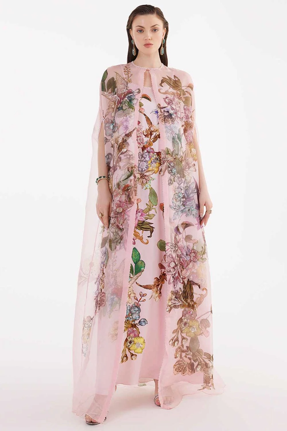 Step into elegance with this Organza Cape and Satin Slip Dress adorned with sequins, pearls, and stones. This ensemble embodies modern sophistication, seamlessly merging opulence and style in every detail.