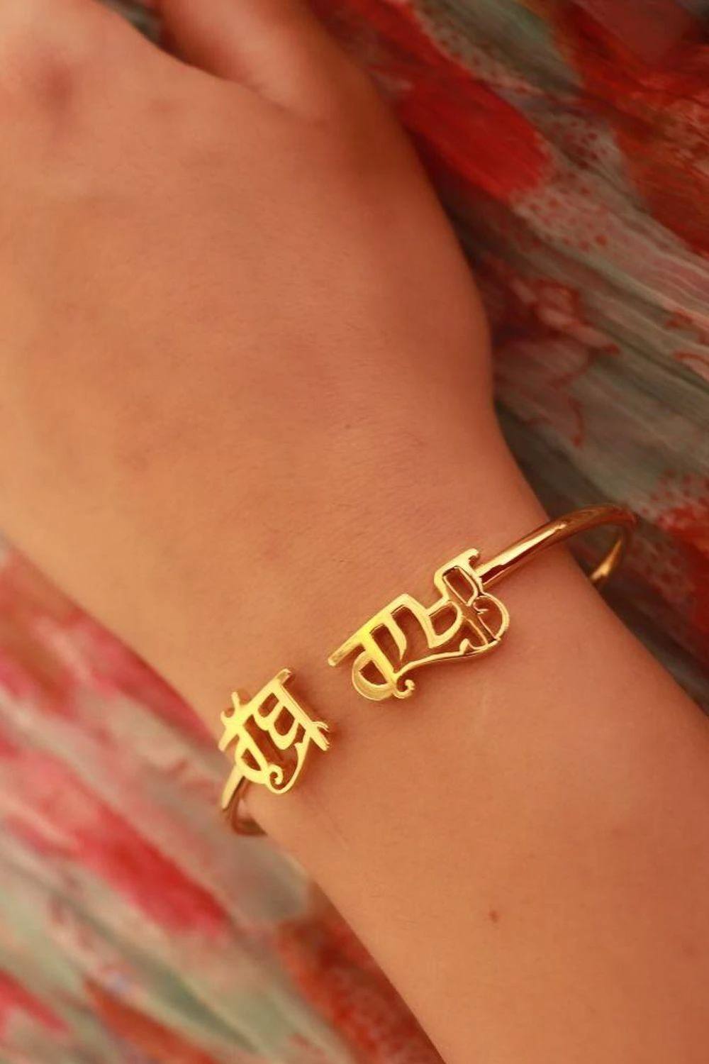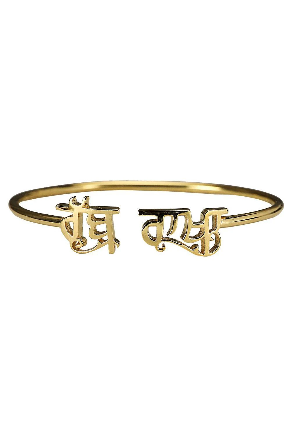 This golden bangle is handcrafted in sterling silver and carved in Punjabi script saying May God be with you & protect you always.This elegant piece will keep you motivated & positive throughout your day.