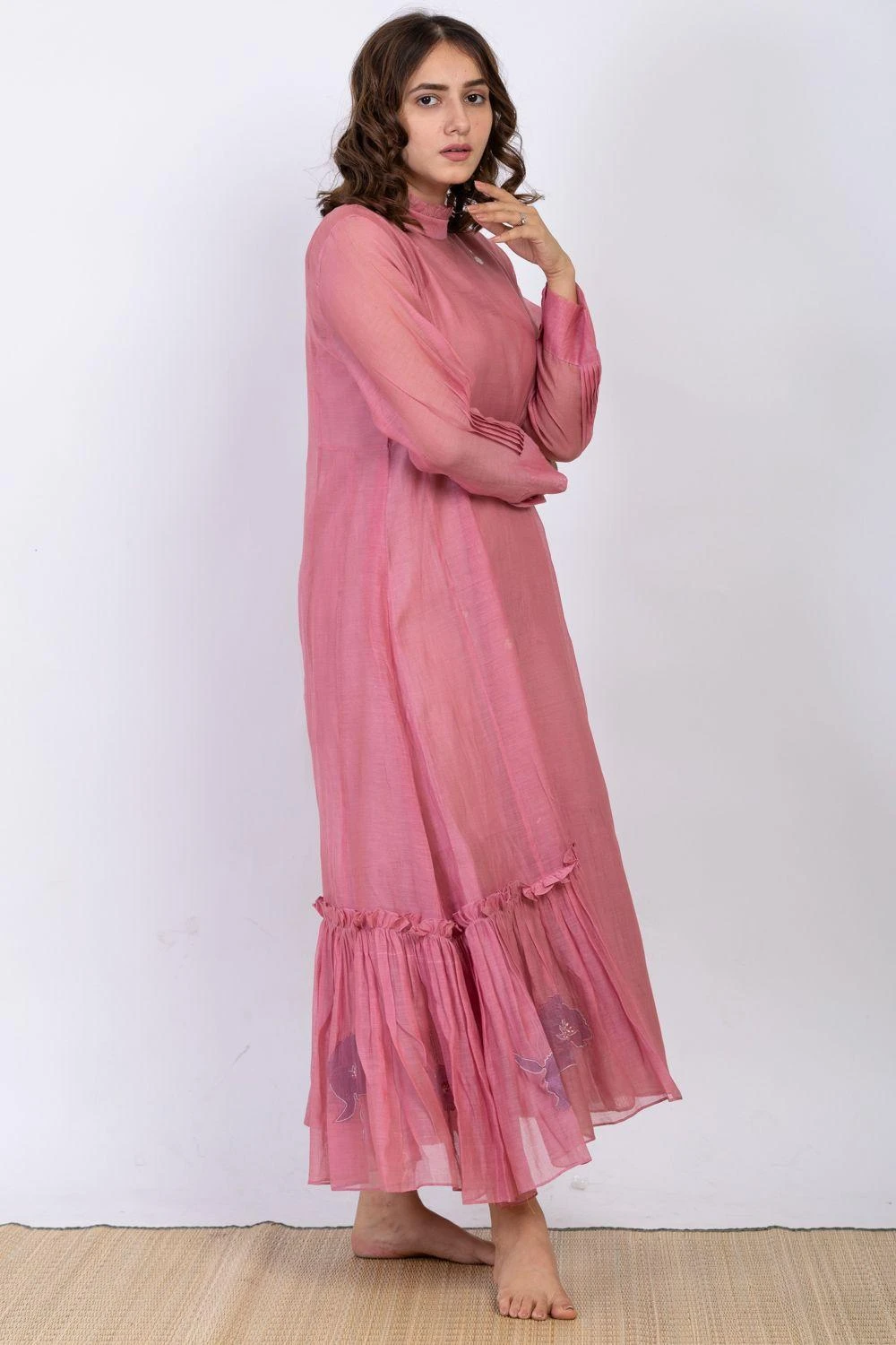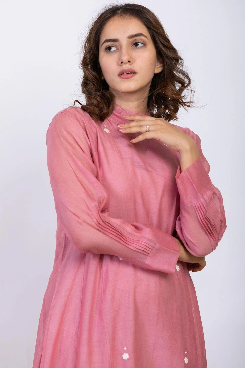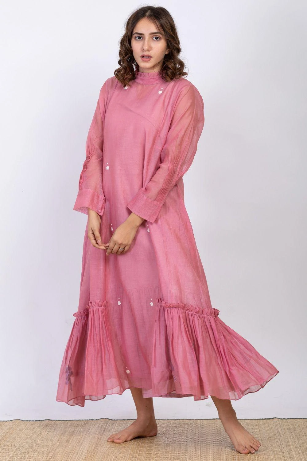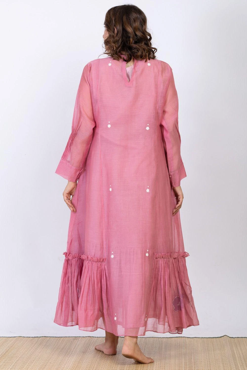 Easy & breezy, this rose pink midi dress is a perfect summer addition. It is cut in soft chanderi silk with details like self texture, dainty floral embroidery & pleats down the hem. It comes along with a cotton silk slip.