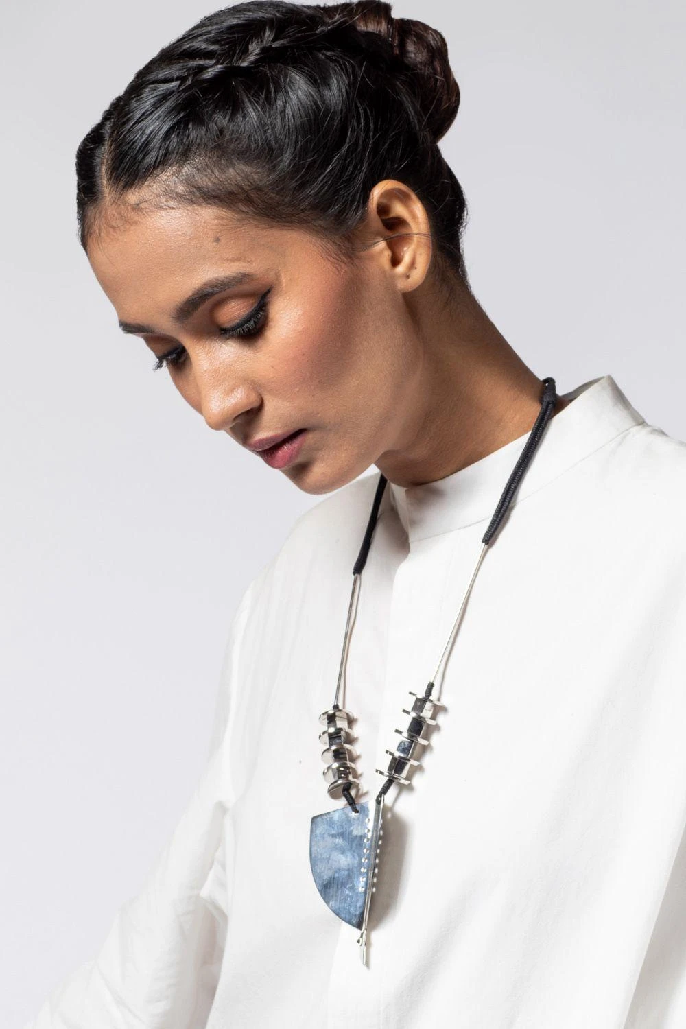 This black long necklace will add the perfect amount of edge to your looks. It is curated in black threads with a stainless steel pendant in the centre. Style it with a dress or kurta for a chic look.
