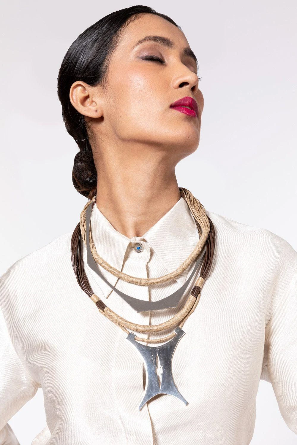 Add an eclectic element to your looks with this jute & thread necklace. It is crafted in brown threads & jute strung to a stainless steel pendant. Style it with a crisp white shirt.