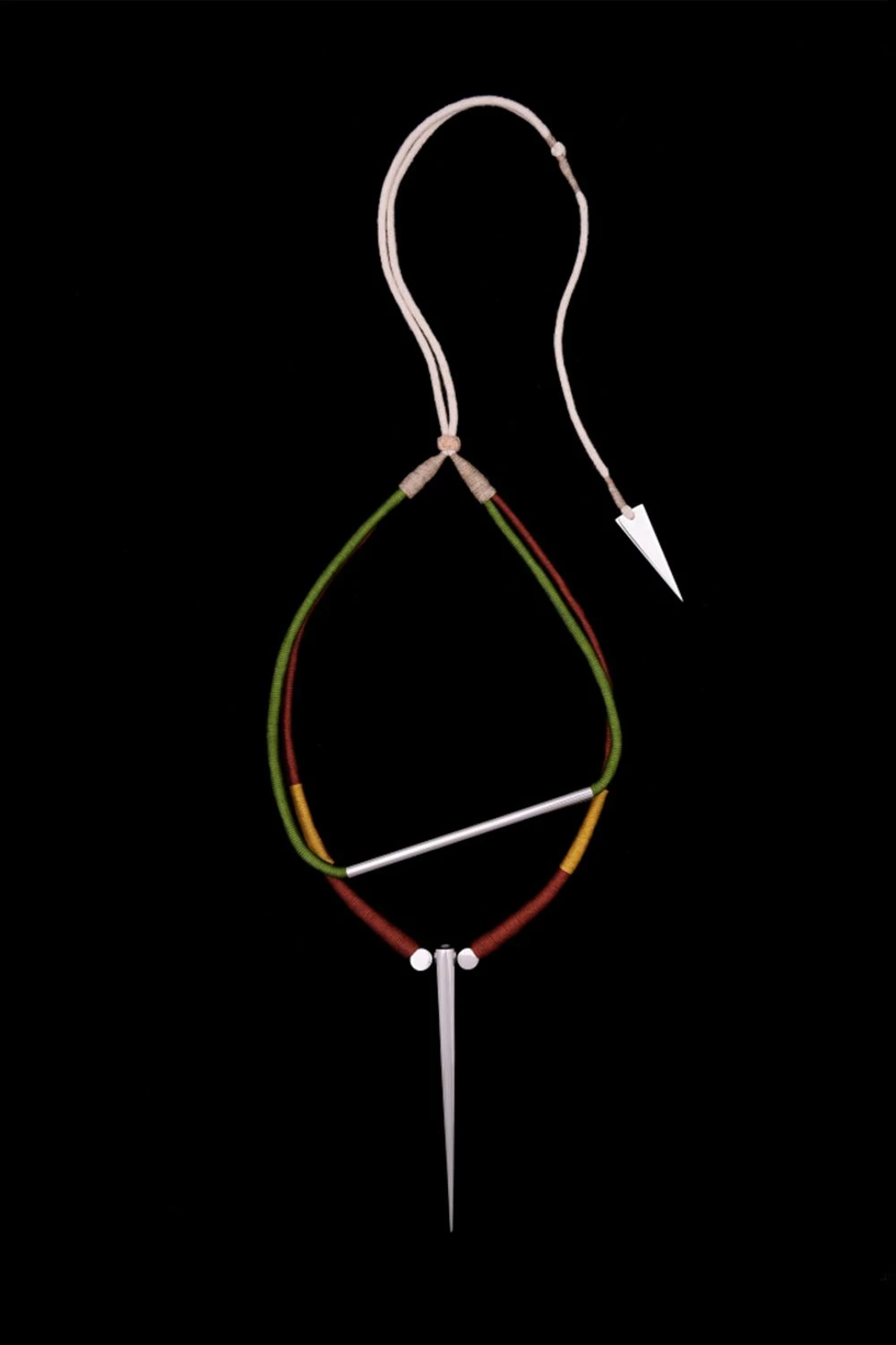 Make a chic style statement with this multi-coloured neck piece. It is crafted in brown, yellow & green thread, jute & stainless steel. You can style it with a crisp white shirt for a pop of colour.