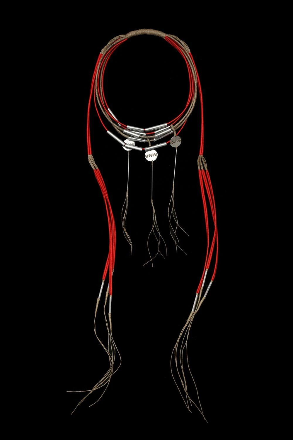 This stylish layered necklace is set in a vibrant red jute with stainless steel details. This one of a kind piece radiates a boho vibe & can be paired with a kaftan or summer dress.