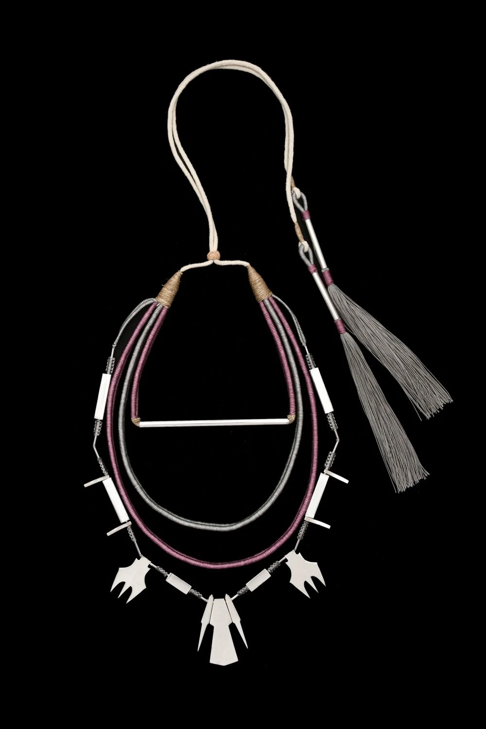 This statement grey layered necklace is made from geisha threads & stainless steel. This chic piece can be styled with a white tunic to effortlessly accessorise your look.