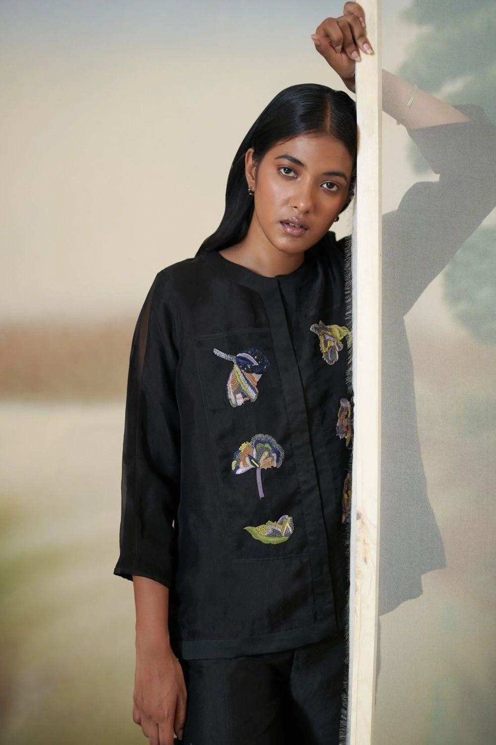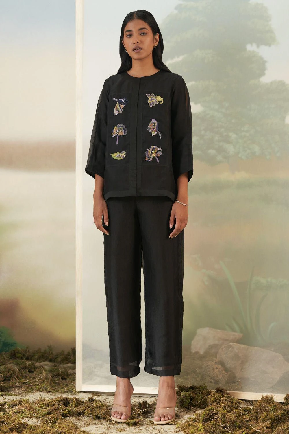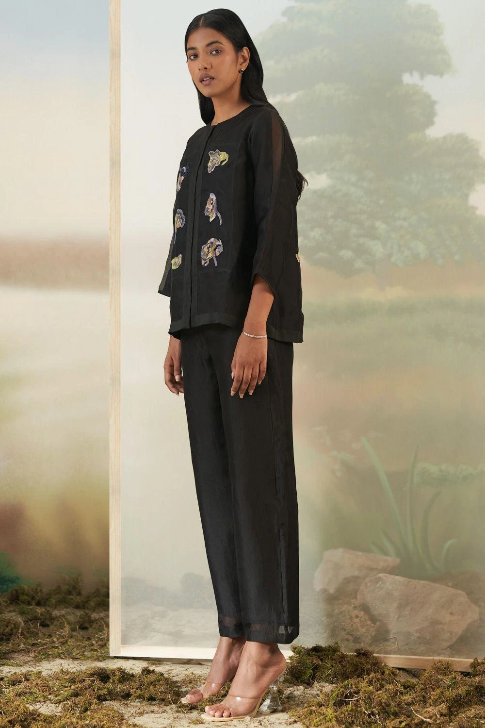 Elevate your style with this timeless black co-ord set. The floral embellished jacket and straight-fit pants exude sophistication and charm, making it a classic choice for any occasion.