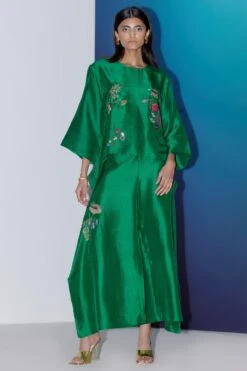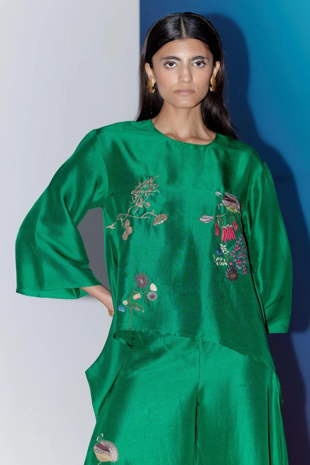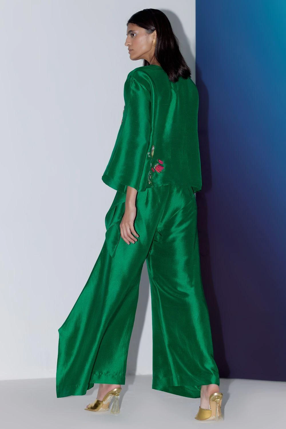 Immerse yourself in exquisite craftsmanship with this Asymmetric Top and Wide-Legged Trousers. Intricate motifs, hand-drawn in zardozi and silk threads, adorn this ensemble, showcasing meticulous artistry.