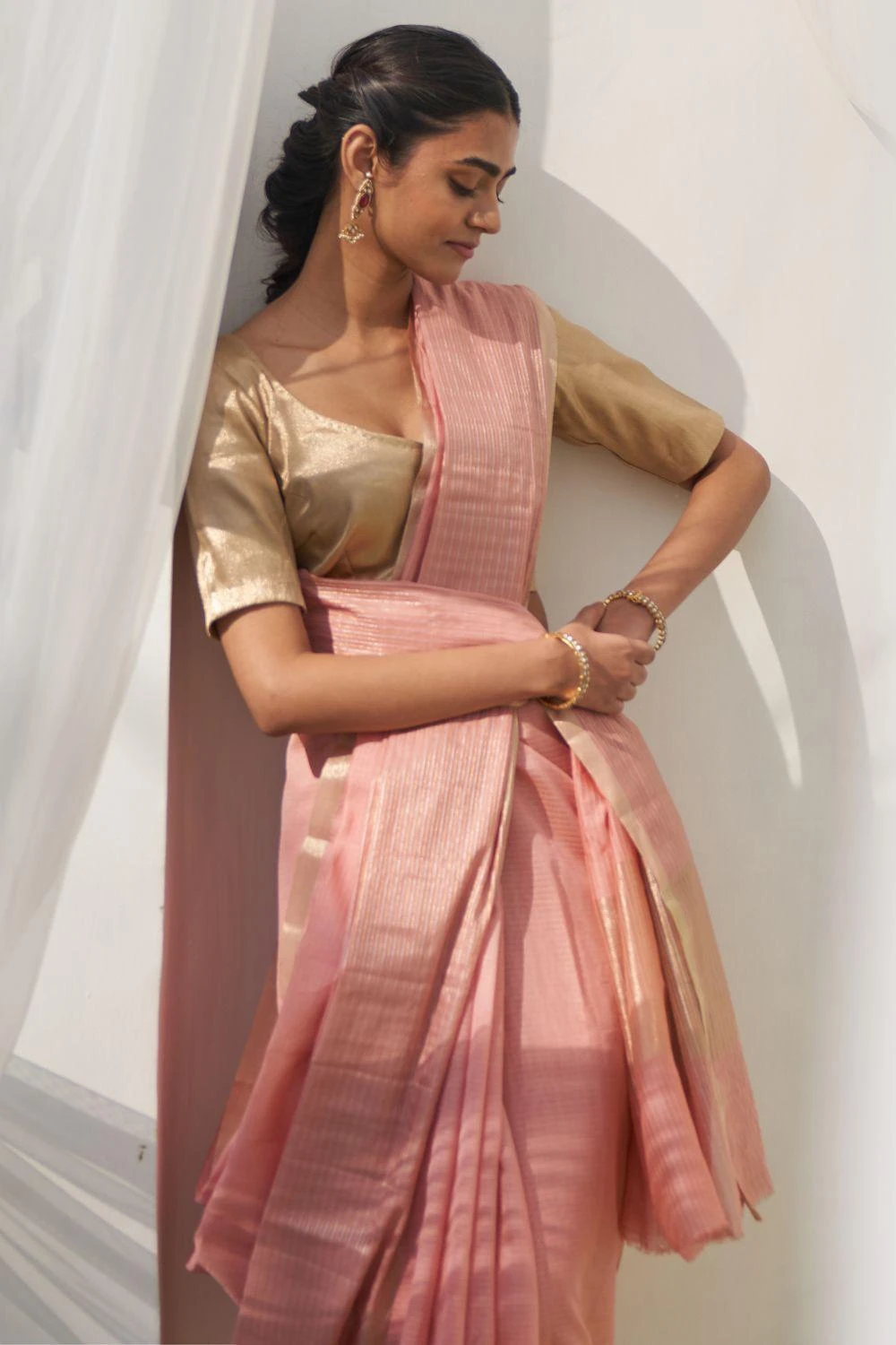 Indulge in the ethereal allure of this sari. Delicate gold-silver stripes adorn the border, accompanied by a golden selvedge. The ensemble includes an unstitched base fabric for the blouse with intricate gold weave that perfectly complements the sari