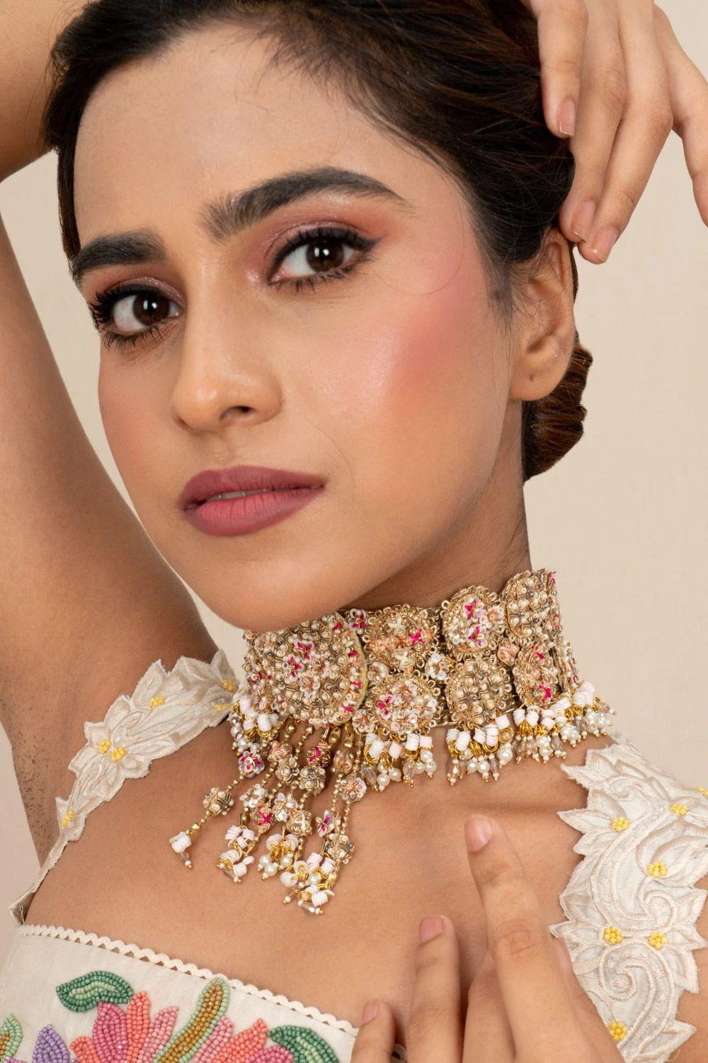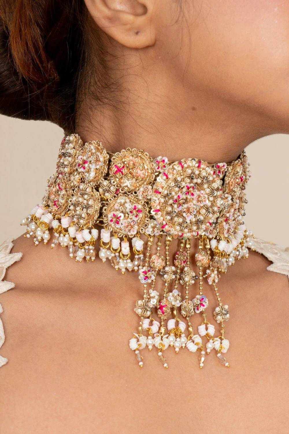 Indulge in the charm of this floral hand-embellished choker, adorned with delicate details and complemented by graceful tassels. This exquisite piece brings an elegant touch to any ensemble, adding a hint of allure and femininity to your neckline.