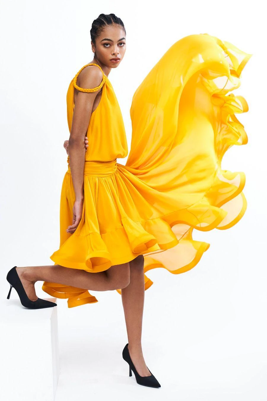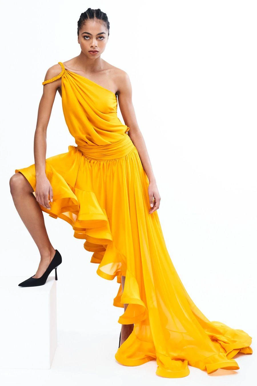 If you’re looking for a head-turning statement-making gown that isn’t too heavy, this is the dress for you. This drop waisted asymmetrical high low gown has a braided one shoulder. Add a pair of statement earrings & heels to complete the look.
