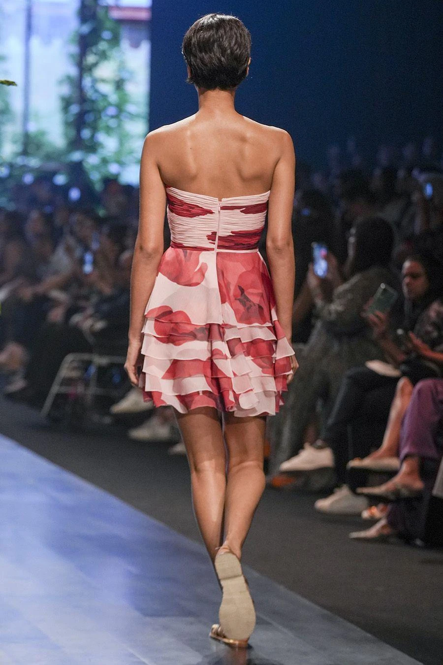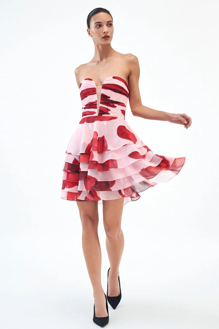 Prepare to bring on the ritz and glitz with this mini dress. Crafted in crinkled chiffon, this strapless dress features a plunge neck with a botanical print and a layered hem. Style it with a pair of statement earrings & heels to complete the look.