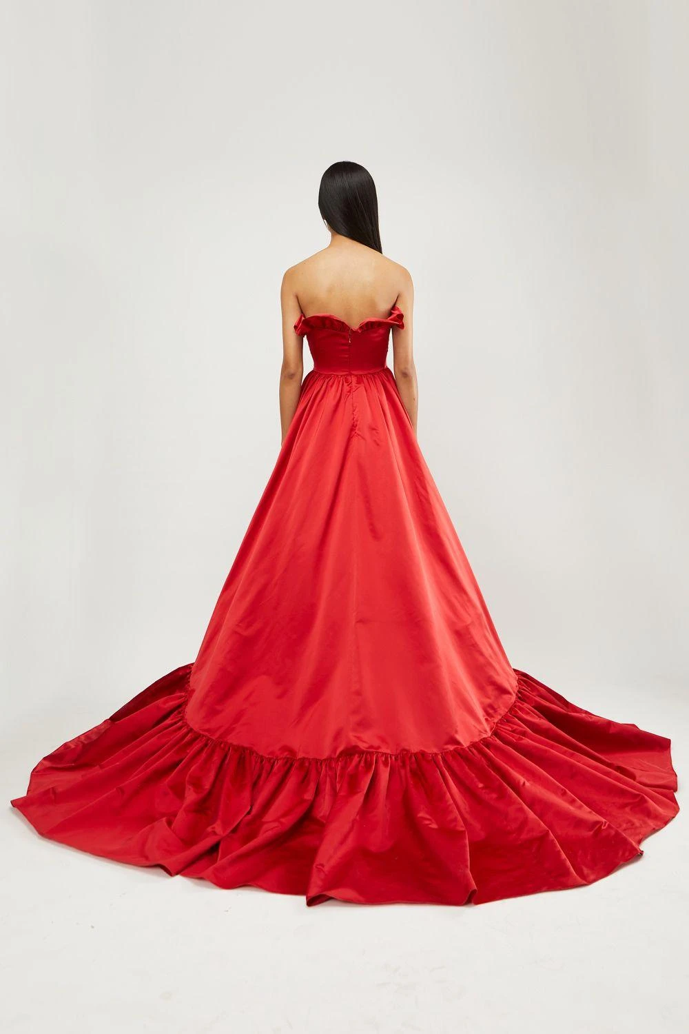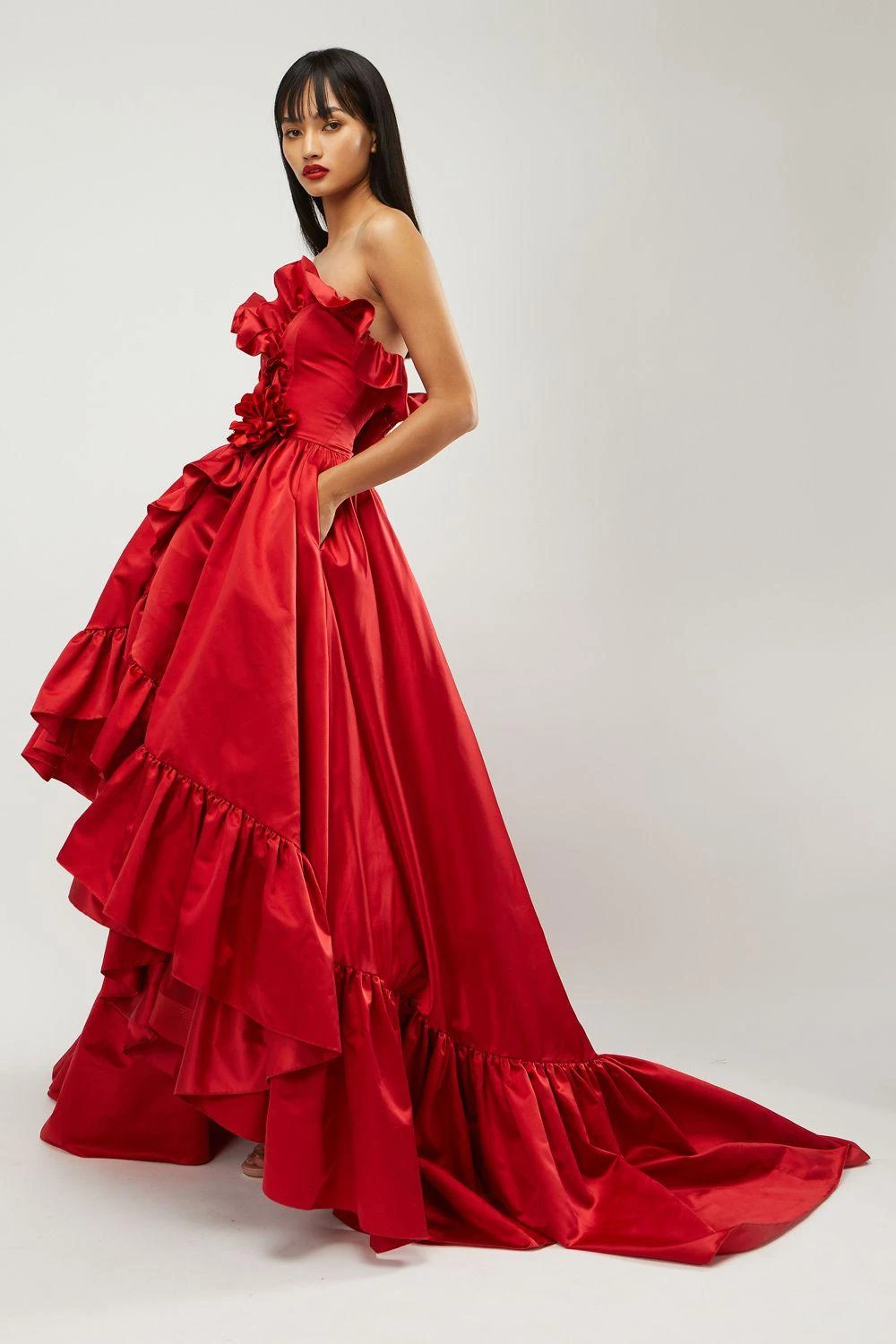 Prepare to bring on the ritz and glitz with this red high low gown. Crafted in duchess satin, this strapless dress features ruffled bodice and rosette. Style this gown with a pair of statement earrings and heels to complete the look.