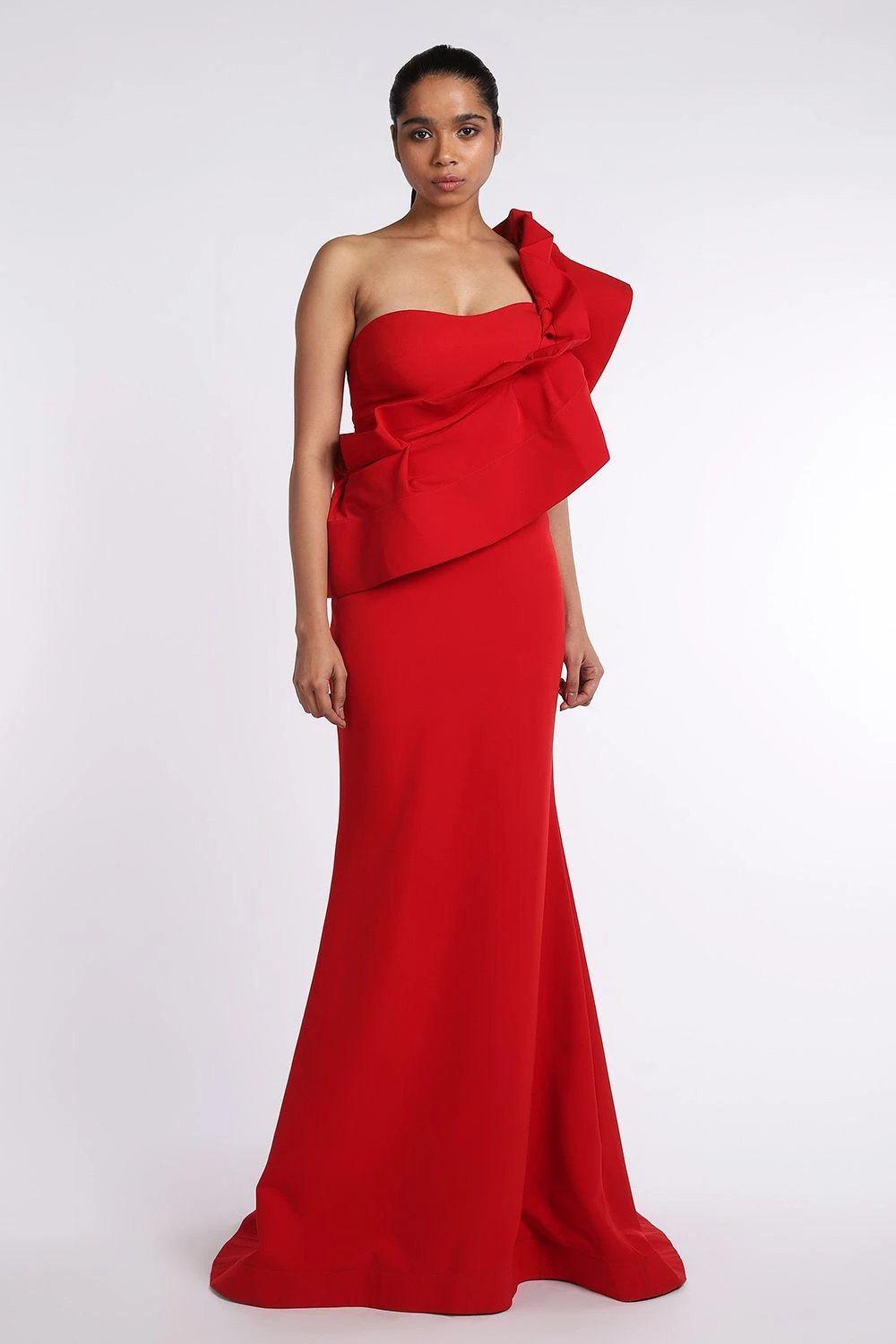 In a bold red, this one shoulder, slim mermaid gown has all the dramatic details to make a statement.