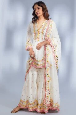 Indulge in the ethereal charm of this kurta sharara set, crafted in organic cotton. The intricately embroidered kurta features exquisite threadwork, mirror accents, and buttis, while the scalloped sharara & dupatta complete the ensemble with finesse.