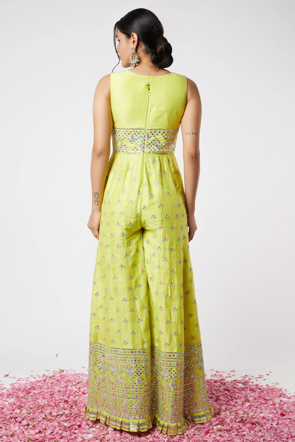 Put a modern spin to your festive closet with this lime jumpsuit. It is cut in cotton silk with gota & mirror work all over. You can style it with a pair of statement earrings and a clutch.
