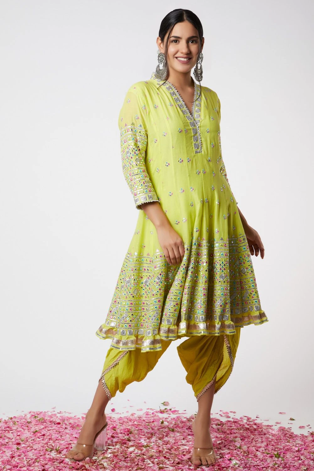 This short anarkali in soft lime is embroidered with zardosi and delicate gota motifs all over highlighting the neckline. It comes along with a pair of dhotis to keep it light & young for summer festivities.