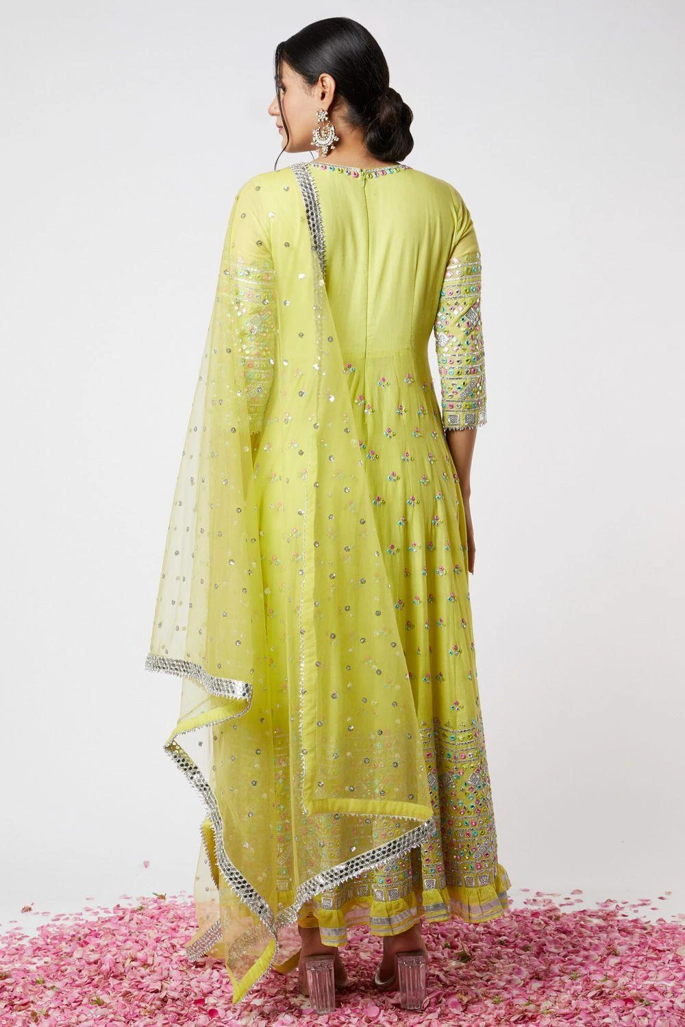With delicate motifs on a soft lime cotton base, this long overlapping anarkali is paired with churidar and a beautifully embellished dupatta. The neckline is enhanced with lavish gota, mirror and thread embroidery.